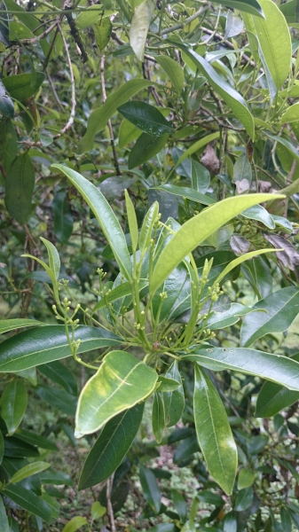 - 葉對生,柄長 1~2 公分,葉片革質,矩圓形、長圓形至長橢圓形,長 5~15 公分,寬 2.5~6 公分,兩端狹尖,偶先端鈍圓或微凹,全緣,兩面光滑。