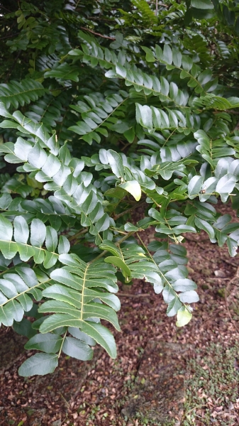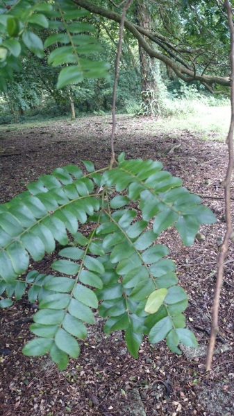 - 葉為互生(近於對生),奇數羽狀複葉,長 20~50 公分;小葉 15~30 枚,排成兩列狀,長橢圓形至鐮刀形,基部甚歪,鈍,紙質,全緣,具油腺點,有濃烈的芳香味,表面呈有光澤的綠色,背面淡黃綠色;中肋於表面略凹下,而於背面較隆起,側脈 3~4 對,不明顯;表面光滑無毛,背面疏生毛茸