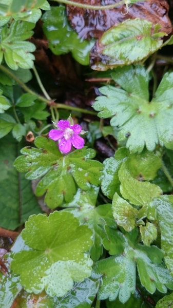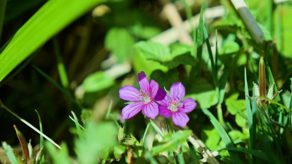- 花瓣五,紫紅色或桃紅色,花瓣上均帶有不明顯的深紫紅色細條紋,雄蕊十,均是可孕雄蕊,雌蕊則單一(心皮五)。為了避免自花授粉,本種採取雄蕊、雌蕊成熟時期錯開的機制。每一朵花的雄蕊先成熟,等到雄蕊授粉結束後,那一朵花的雌蕊才接著成熟。花萼綠色,五裂,裂片尖端尾狀,花萼背面和花柄均被有明顯的直柔毛。