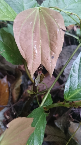 - 單葉互生,葉外形略似心形,先端漸尖,由葉尖向葉基深裂或淺裂成燕尾狀,有明顯的平行脈略隆起於背面,厚紙質,全緣