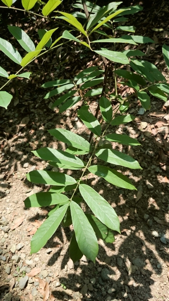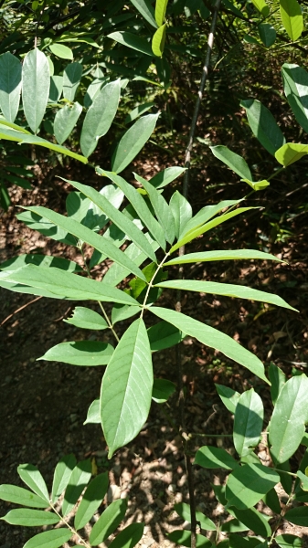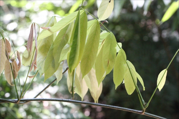 - 大型羽狀複葉,小葉 9~13 枚,除頂生小葉外,其他為對生,倒披針形或近似長橢圓形,先端鈍而銳尖,表面光滑無毛,背面則密布有柔毛,厚紙質,全緣;頂生小葉有短柄,其他小葉近似無柄而有關節性膨大。