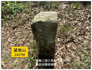 望美山,海拔1426公尺,位於南投縣信義鄉獵人古道,立有省政府圖根補點(另一面刻有聯勤三等三角點內補363號),山頂西向展望佳,可眺望羅娜山、俯瞰阿里不動溪。(資料來源:101)