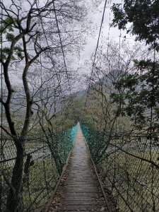 - 走過大安溪唯一的吊橋象鼻吊橋,之後陡上到千兩山南峰,之後坡度變緩,過千兩山北峰後下到中象公路鞍部,往細道邦的山徑就在對面,較少人走,部分路徑不是很清楚,但細心找,都可找到路標。之後沿中象公路下到象鼻,象鼻山最矮,但很有挑戰,很陡,全程沒有一條拉繩,主因還是太少人爬,中間一段鑽在山棕櫚下,這也有好處,抓著棕櫚葉就比較好爬陡坡了。