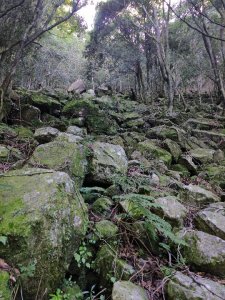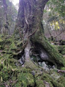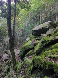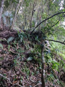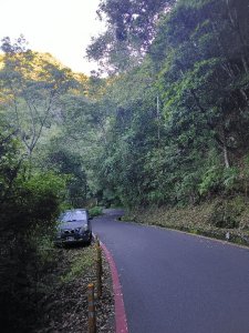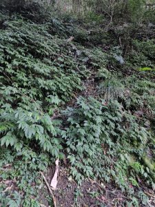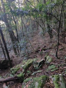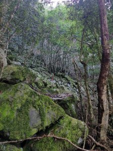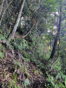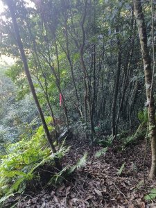 - 鳶嘴爬了幾十次,26K的溪谷接鳶嘴西稜也走過幾次,就這條沒走過,最近注意到有粉紅色路條,料是新的路線,便去走了。以前沒路,最近闢的,必是陡上難走。26K路口上去這段最陡,還好有繩可拉。中經一石瀑,再切上傳統路線。若非一路粉紅色路標,是看不出有路的,太少人走了。路是人走出來的,沒什麼人走,根本沒有路的樣子。
