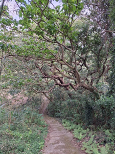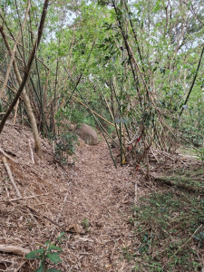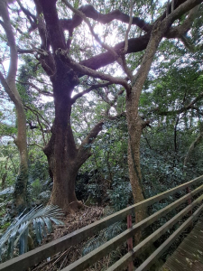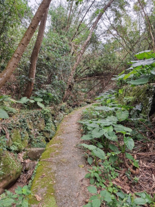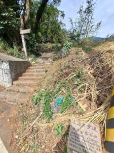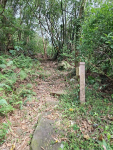 - ■竹林步道為昔日挑炭古道,沿途有駁坎亦有路樁指示,過去應為大眾路線,但似有些荒廢,僅為農作用路;中途叉路左接阿昌林道,北往二崎農場及吳氏宗祠,本次取右往永春寮。