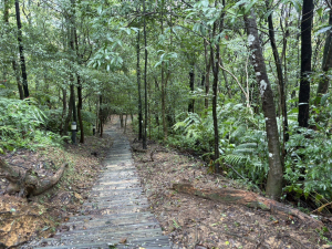 觀音巖步道全長0.7公里,從平溪區公所出發,沿著山徑走進觀音巖,廟旁矗立著記錄地方開發史的「頌德碑」,靜靜述說著歲月的痕跡。登上觀景平台,耳邊響起平溪歌謠〈咱的土地〉— 「一條鐵路、兩條溪、三個庄頭、四條街、五路人馬攏到齊……」這旋律彷彿把人帶回那個山城鼎盛的年代。霧雨輕瀰,整個平溪聚落在眼前鋪展,山巒朦朧,讓人真切感受到土地的呼吸與溫度。