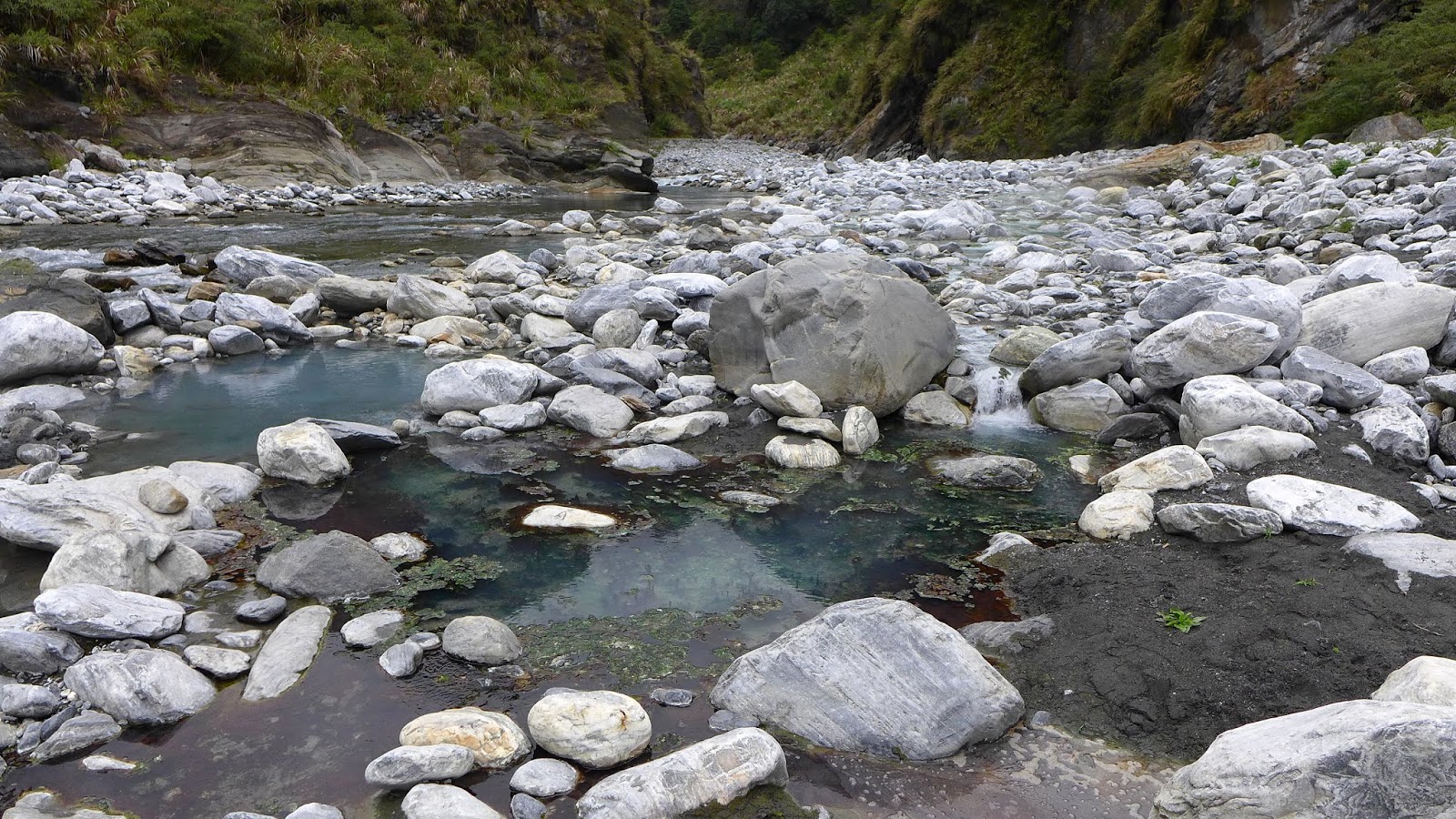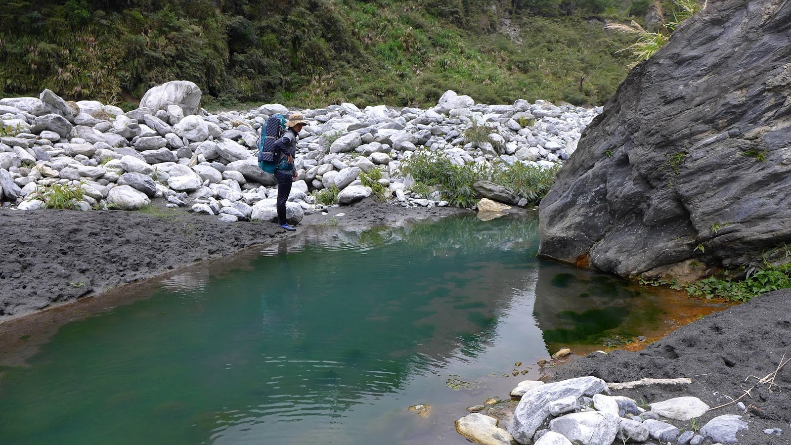 溫泉從山壁裡不斷流出,源頭溫度非常的高,這裡曾經有著300M長的溫泉河,不過每年溪谷環境都在變,湯池築出來樣貌也都不同,這趟雖然我們看到的規模不大,但也有近百米長,對我們來說也足夠了。