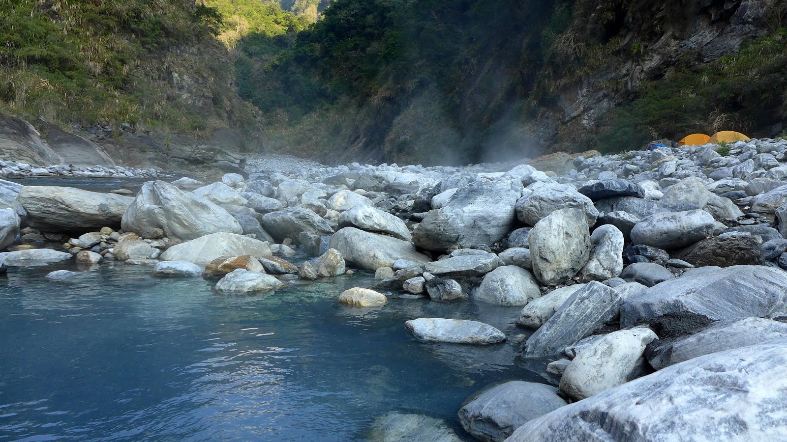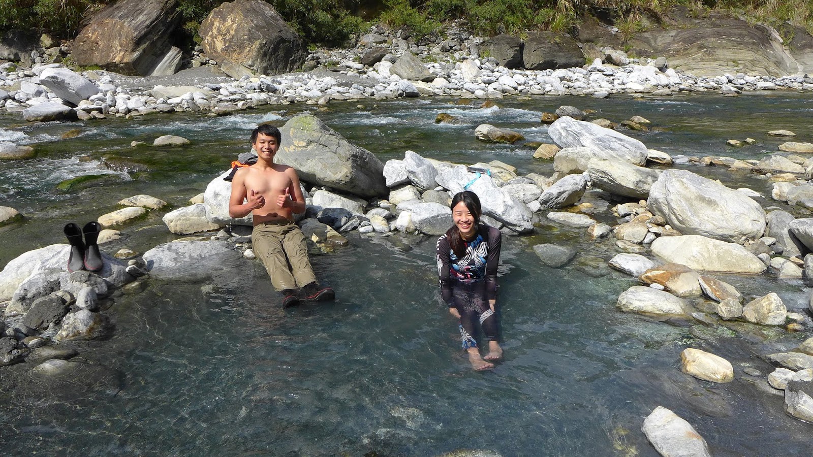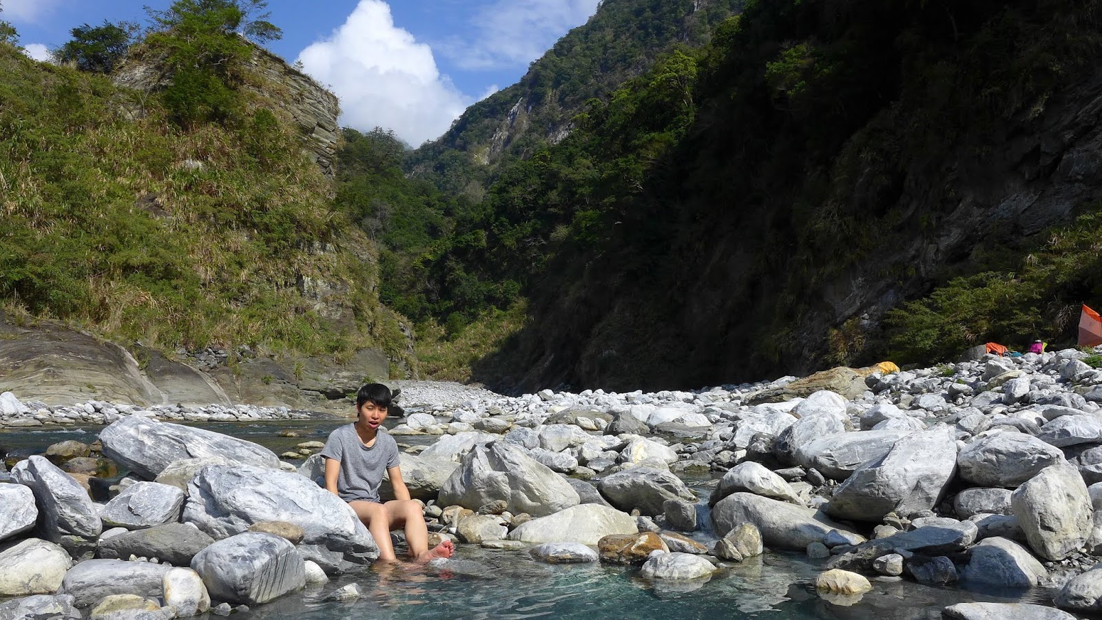 河谷晚上沒風,眾人舒服地一夜好眠,早上原預定10點拔營離開,吃過早餐後,把握一點時間好好泡溫泉,二子山溫泉的溫度蠻高的,若沒泡習慣的人可能會有點受不了,我自己是還受得了啦,還蠻爽的,泡一會身體就通紅,感覺全身血液都暢通了。