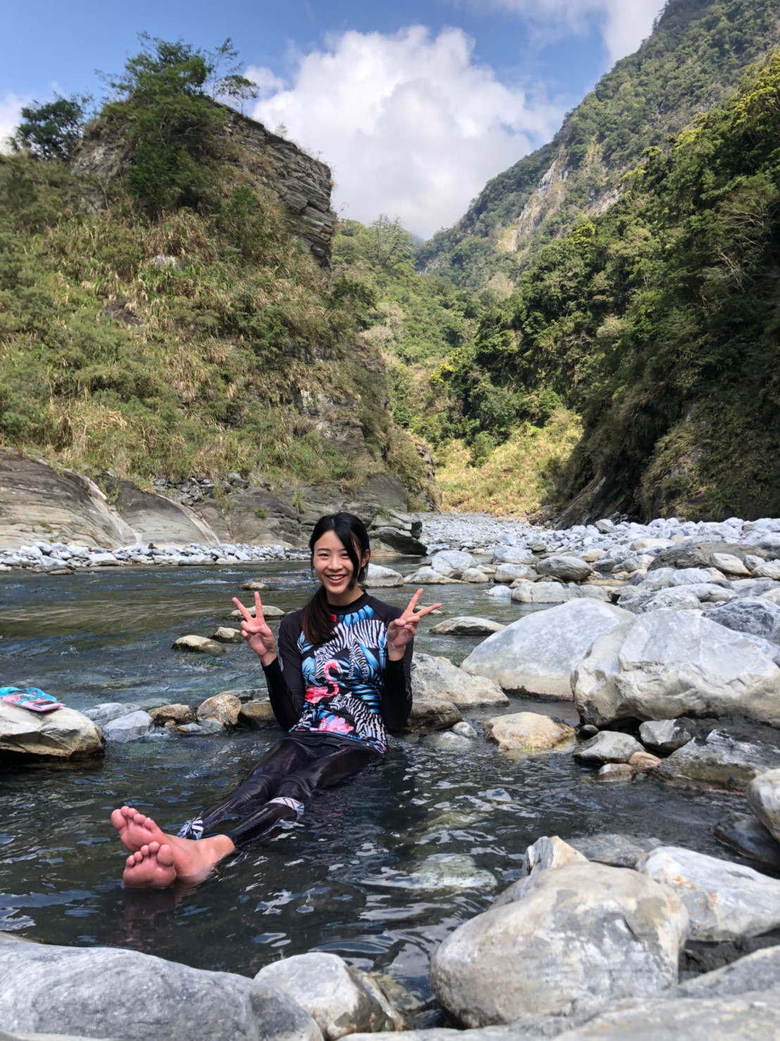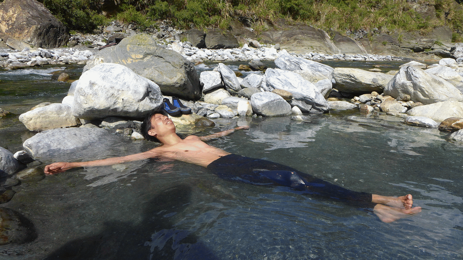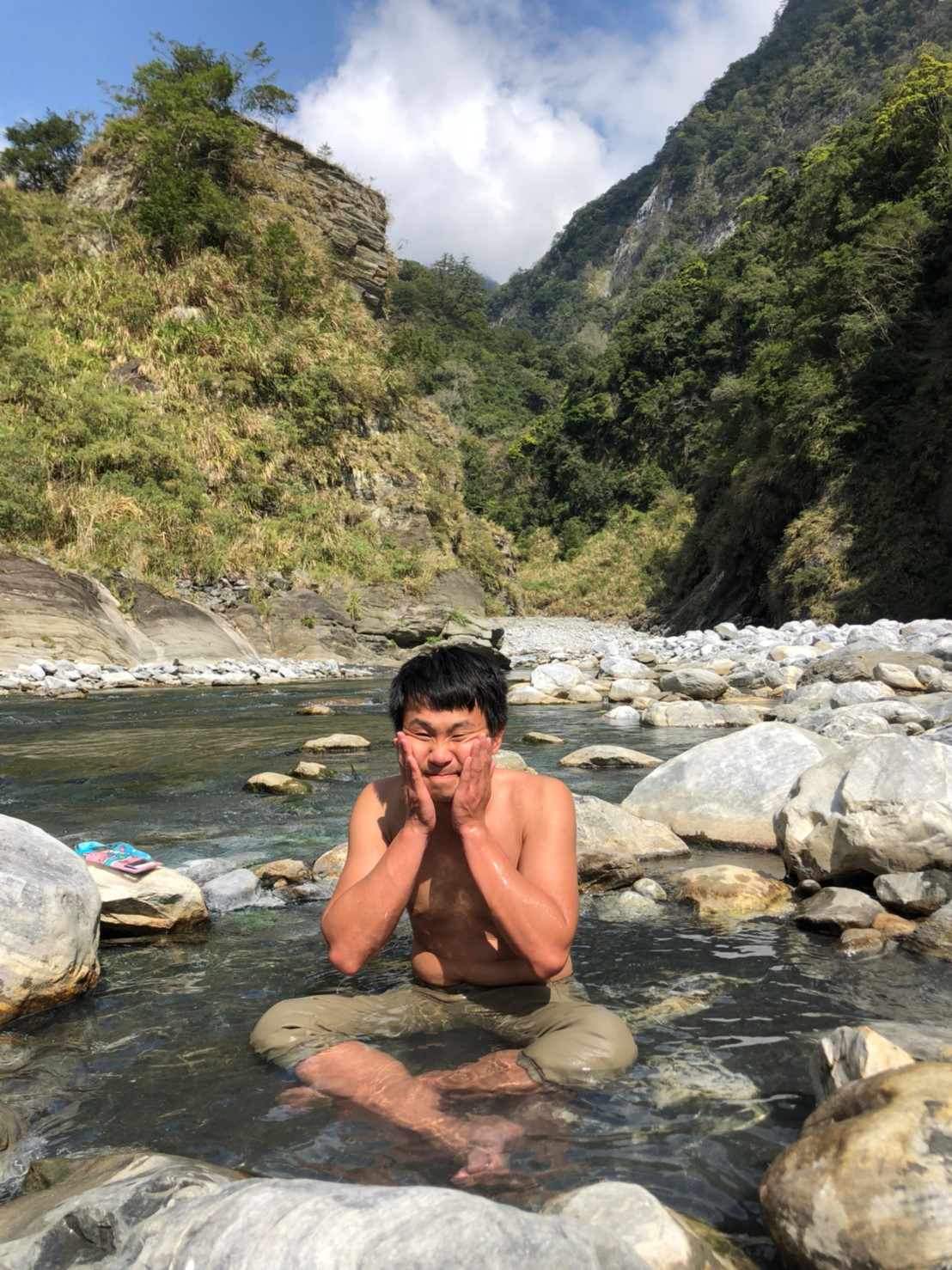 河谷晚上沒風,眾人舒服地一夜好眠,早上原預定10點拔營離開,吃過早餐後,把握一點時間好好泡溫泉,二子山溫泉的溫度蠻高的,若沒泡習慣的人可能會有點受不了,我自己是還受得了啦,還蠻爽的,泡一會身體就通紅,感覺全身血液都暢通了。