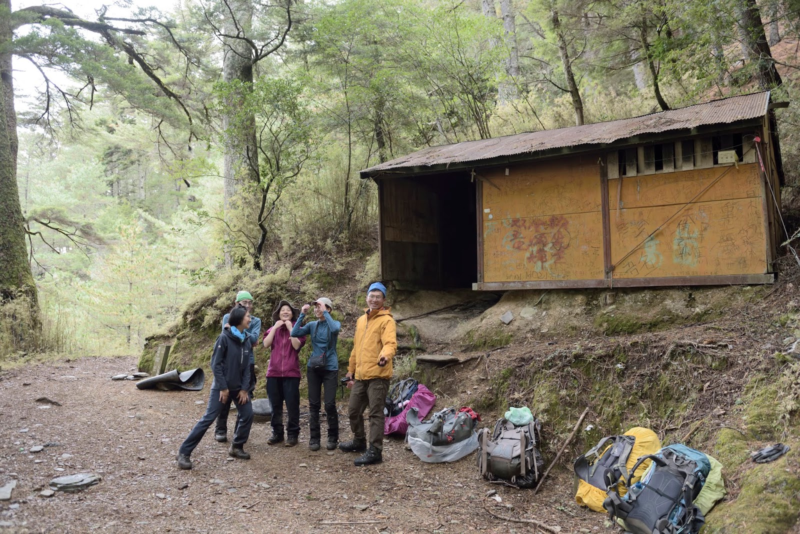 後來算算時間差不多,就從中央金礦輕裝出發,往東埔方向走去。原本以為大概走個兩公里就會看到人,沒想到不知不覺也快 3公里,走著走著,過了一個轉角,突然發現在巴奈伊克山屋前面,有幾個人在那裡!我心想八九不離十,絕對是我們的陪走隊,顧不得古道的腰繞路很小條又緊鄰斷崖,直接跑了起來,就為了給他們一個大大的驚喜!