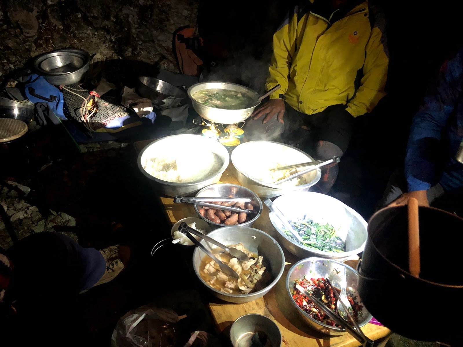 晚上的時候,在山莊跟學長姐吃飯聊天,熱心的學長姐當然會問「你們還有沒有缺什麼啊?」剛開始一定是要說「沒有啦!學長幫我們帶補給上來就很夠了,哪好意思再跟你們要東西!」其實內心是很渴望,能拿到一些好料來加菜的!後來就被學長姐識破,開始把他們家當拿出來一樣ㄧ樣問有沒有什麼需要的,不小心就又多拿了 2 公斤的食物回房間放進背包了哈哈