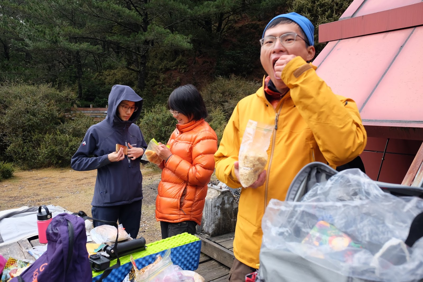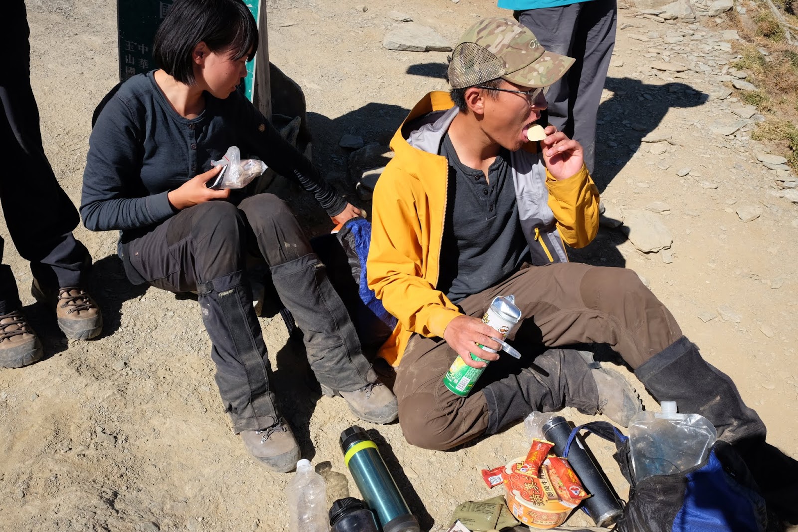 跟學長姐們寒暄一陣子,就不斷被餵食,不管是他們原本自己要吃的粽子,還是預計當點心的麵包,全部推到我們面前,要我們好好吃,才有體力繼續爬哈哈。後來陪走隊以及走比較快的單攻隊員,也從避難山屋走過來向陽叉路大會師!為這次大縱走的補給行程,劃下了一個完美的句點!