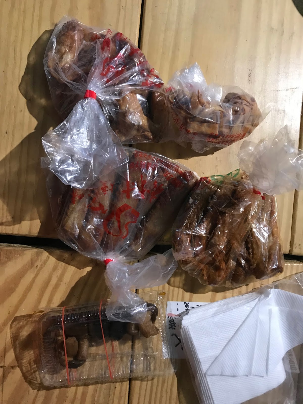 我們跟補給隊道別後,回到避難山屋休息,遇到此行唯一單攻嘉明湖成功的領隊 KJ 學長,拿著一包他背上來送我們的食物,要我親手打開。當時看到外包裝是丹丹漢堡,還以為是漢堡、炸雞。結果一拆開,發現是我當時跟他許願,說很想要吃的煙燻滷味哈哈哈,真是太感謝了!