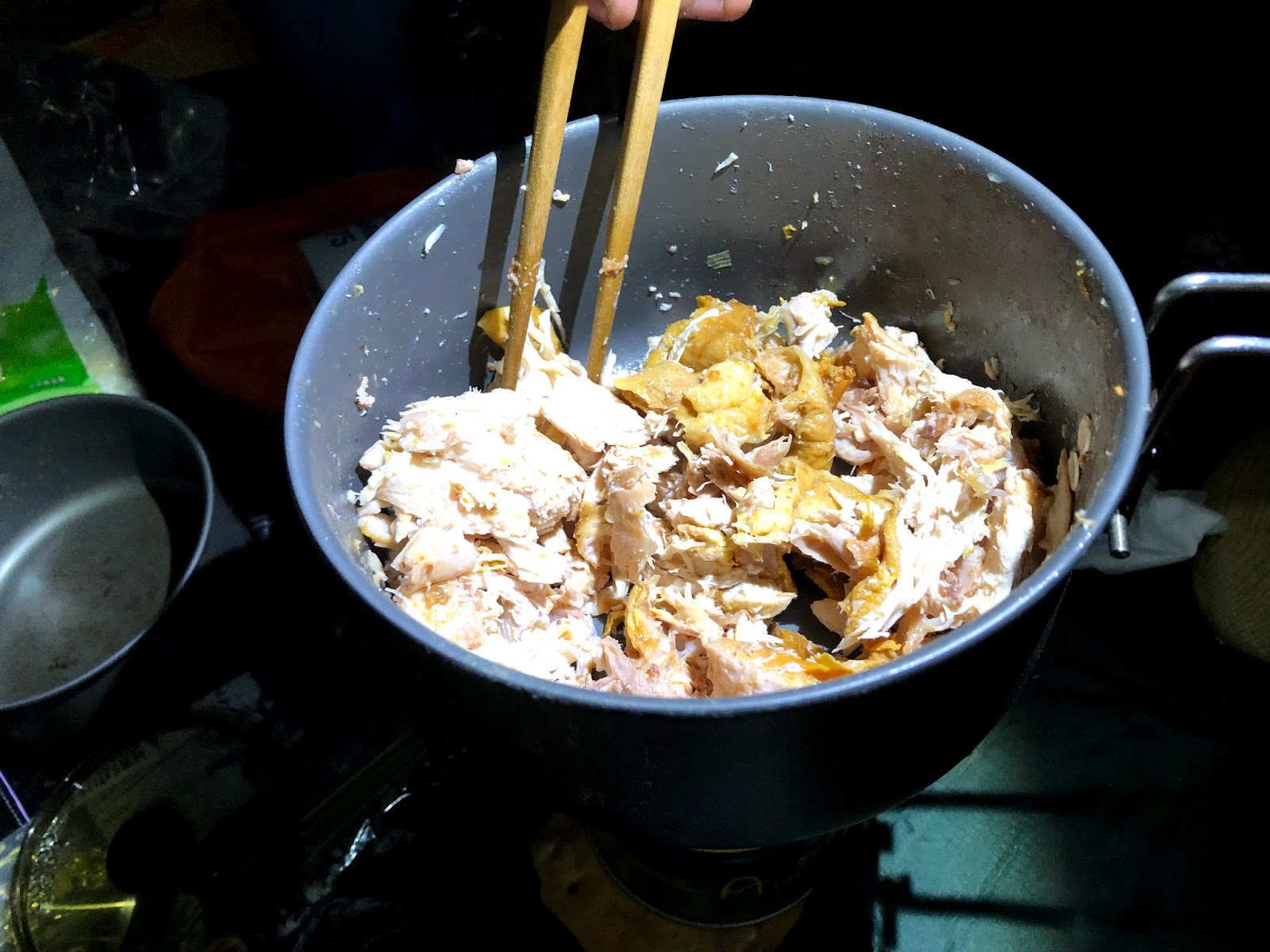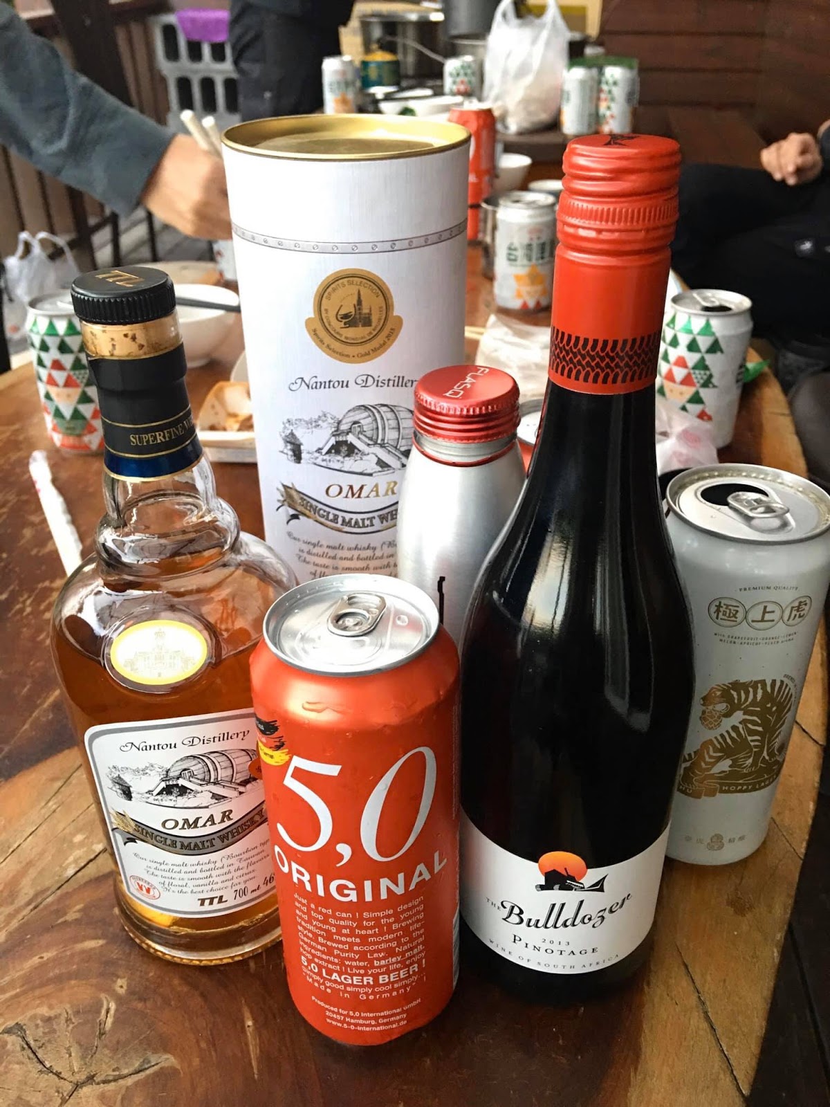 我們只好穿上衣服,跑出帳篷拿補給開始清點,在我們確認補給的時候,協作大哥可能覺得這時候下去會冷死,就決定在我們旁邊的帳篷睡一晚再說。原本我們確認完補給,就要準備繼續睡,結果大哥突然喊說過來吃麵啊,原來是大哥知道我們明天休息,所以就多煮宵夜,要來慰勞我們一下!所以我們就跑去他們帳篷吃起泡麵喝起酒來,吃著有放三層肉的湯麵配著十年威士忌,整個人暖呼呼好舒服!