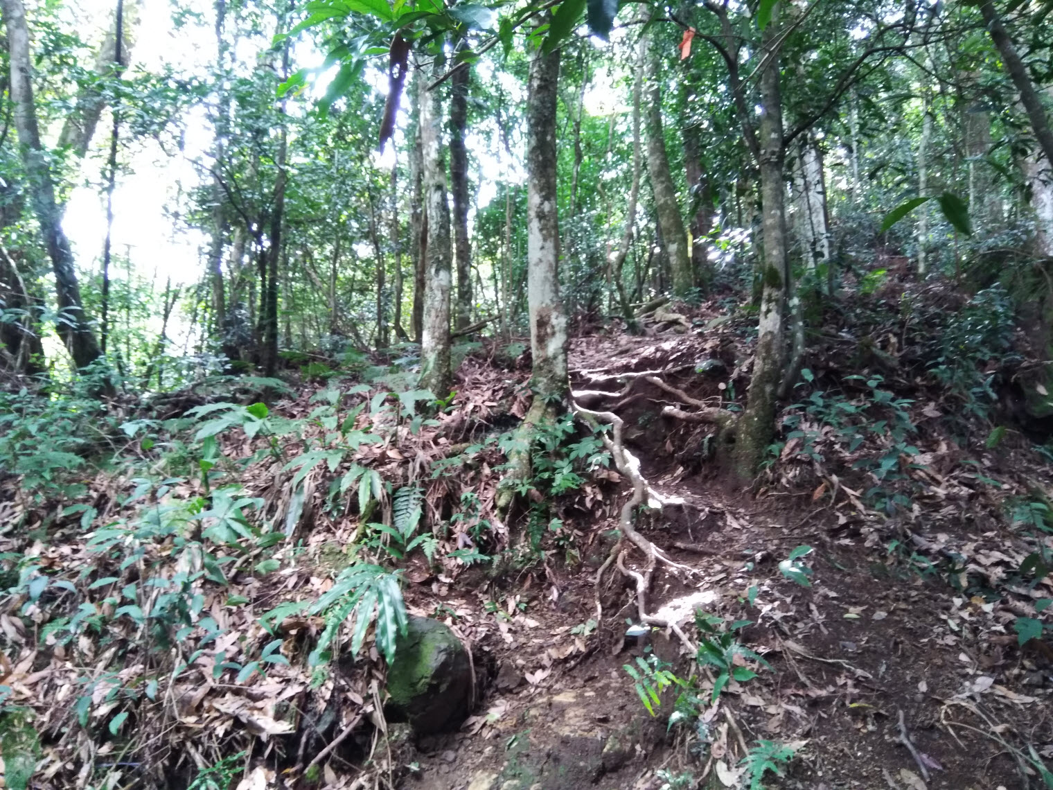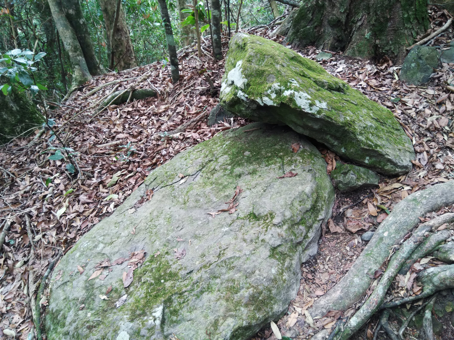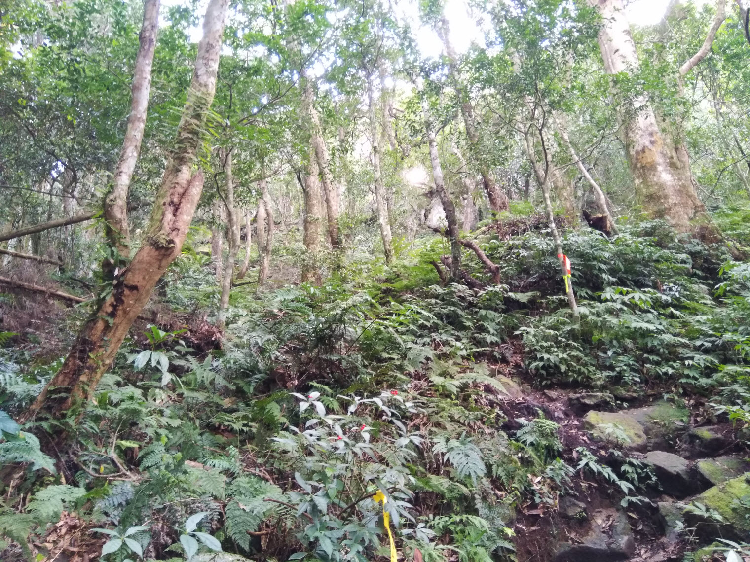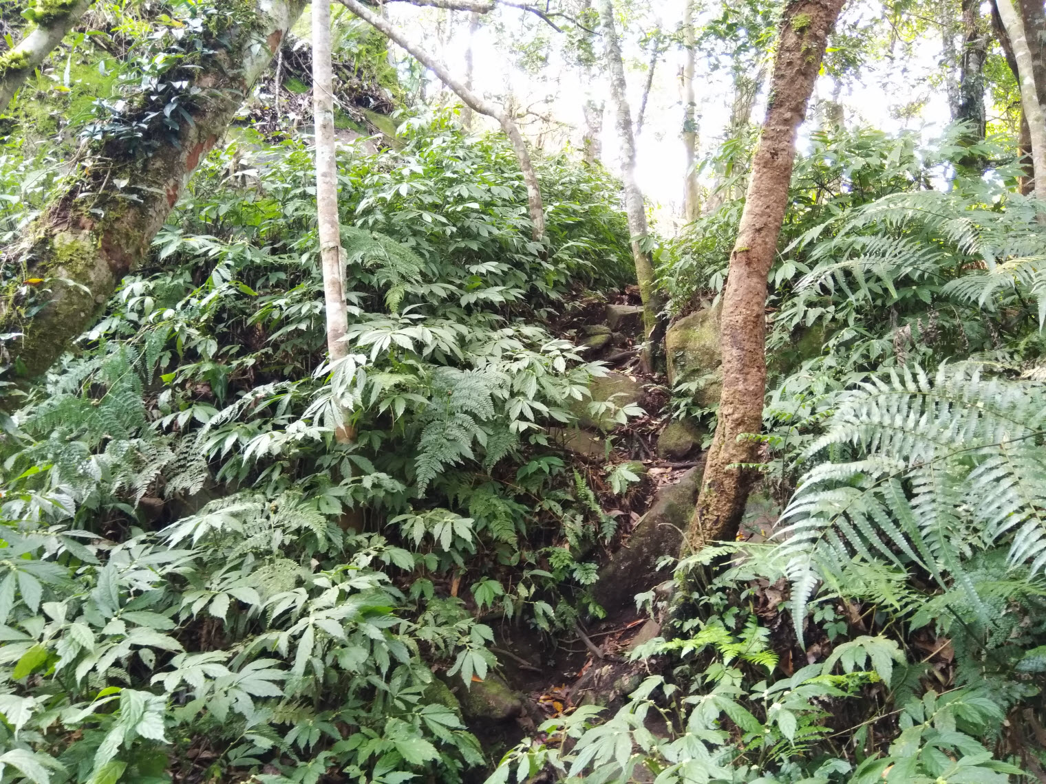 混生林的原始山徑夾雜著長青苔的石塊