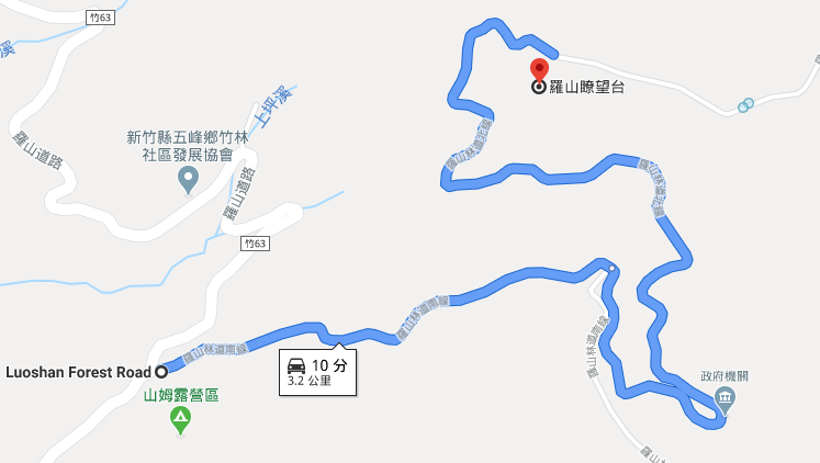 從竹東進入122縣道,行駛約11.6K後左轉竹62鄉道往花園派出所前進,抵達派出所後右轉改走竹63鄉道羅山道路,約行駛6.3K後左轉進入羅山林道,如下圖再行駛3.2K林道即抵達第一登山口停車處