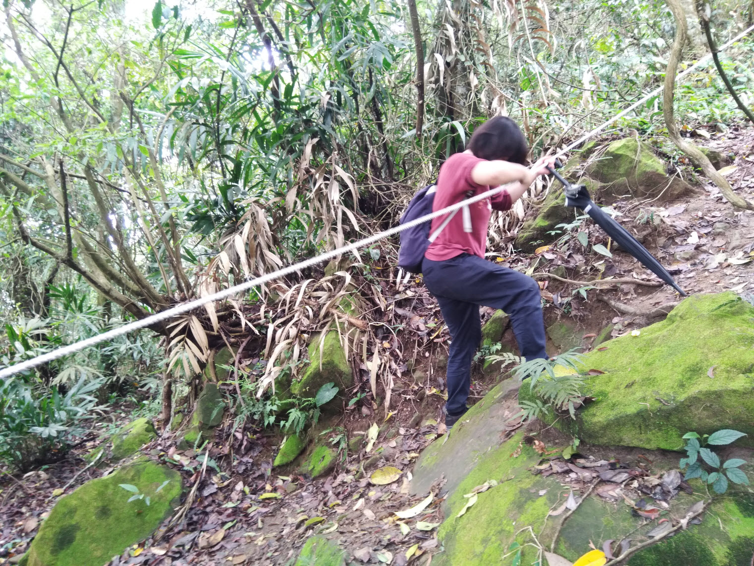 好心的山友提醒來此一遊之人需評估自身能力再上山,由於原始山徑地形無法預料,我是覺得上山是路陡腳很累、但下山是路滑心很累,因此至少需備有一支登山杖才去走比較好