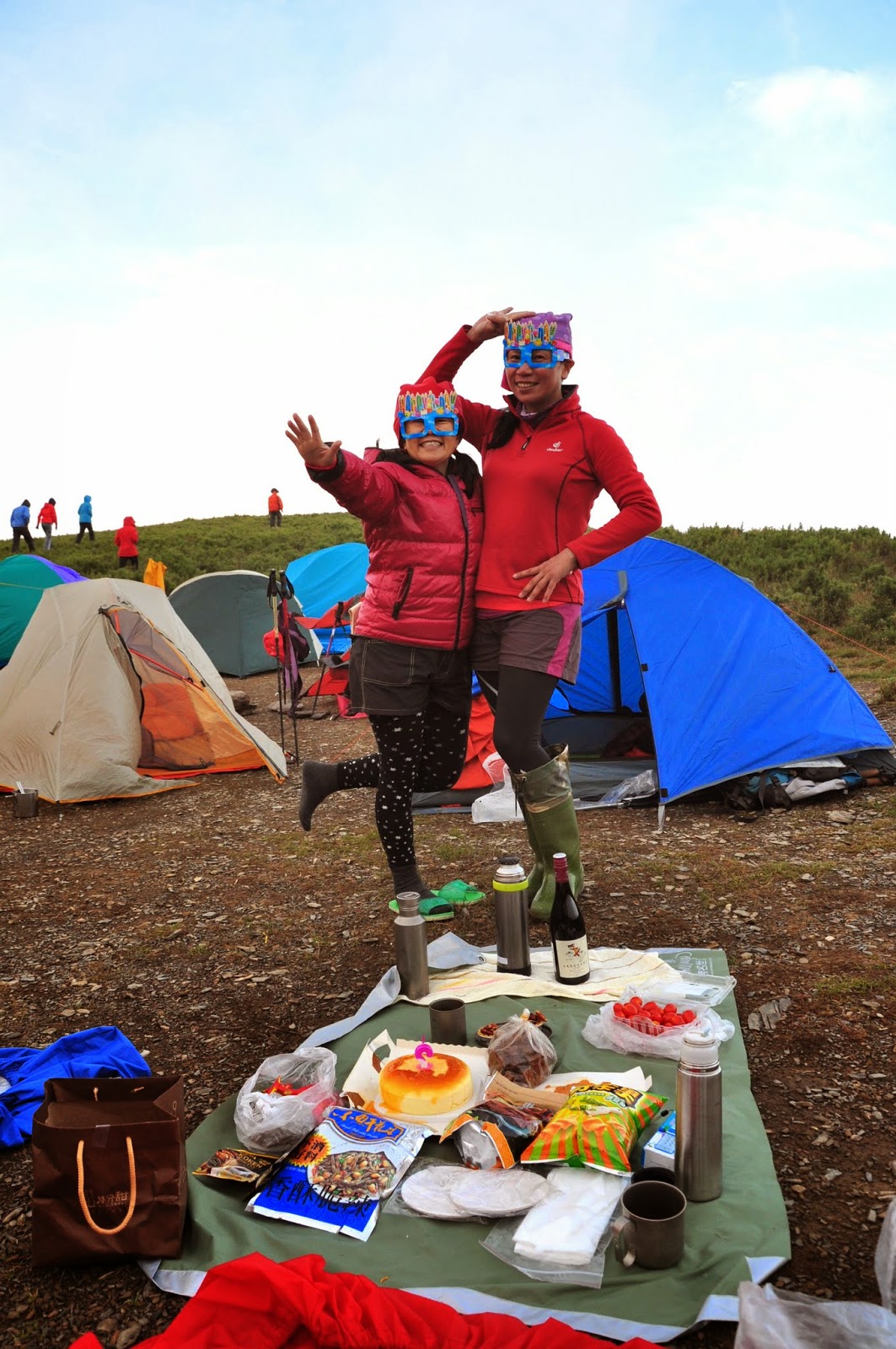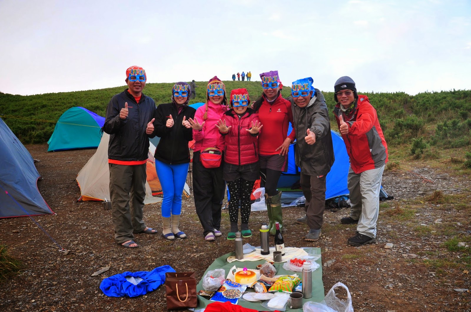 分發我精心準備的派對小道具「Happy Birthday」眼鏡,馬上就有派對氣氛了,再把蛋糕、咖啡端出、零食舖滿整地,有格格台北帶來好吃的小點心、何歡山特地背上來的紅酒、小心心的羊奶頭酒、豆干等,配上大家高聲歡唱的生日快樂歌,雖然海拔3300公尺的小溪營地風咻咻的刮,入夜氣溫不到10度,氣氛卻是熱到最高點,連滿天星斗都出來跟我們一同慶賀,適逢七夕情人節的今天,雖然不知牛郎織女是眾星中的哪一顆,但我們有緣齊聚在此舉辦高山生日趴,真是比牛郎織女相會還要難得,大家直呼真是個有趣的體驗及值得回憶的生日派對呢!