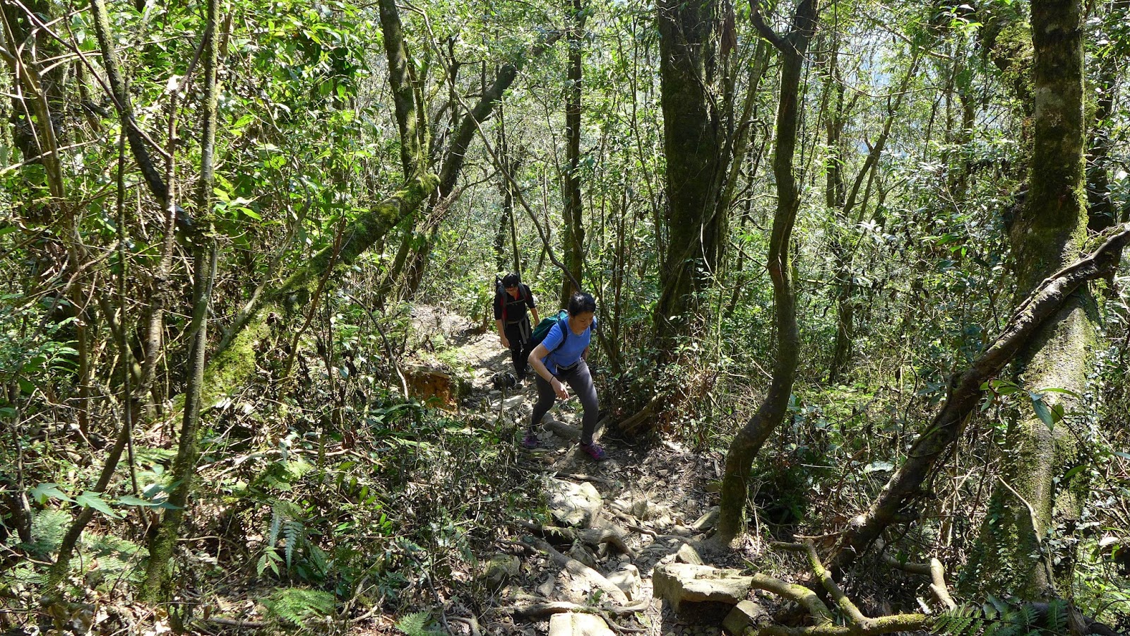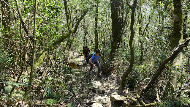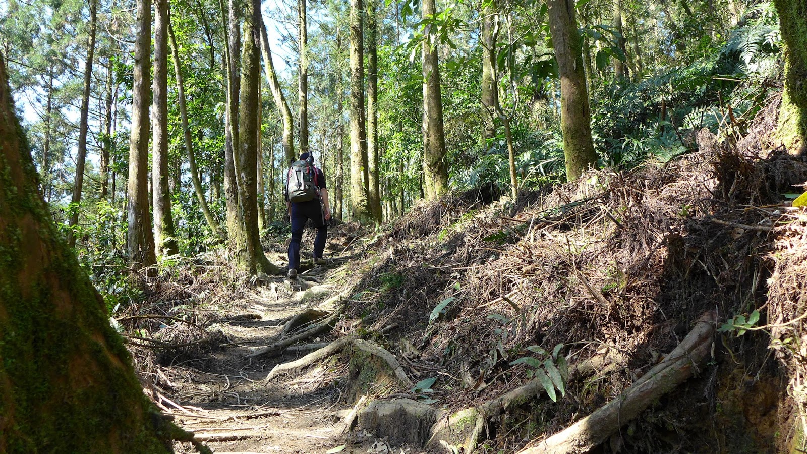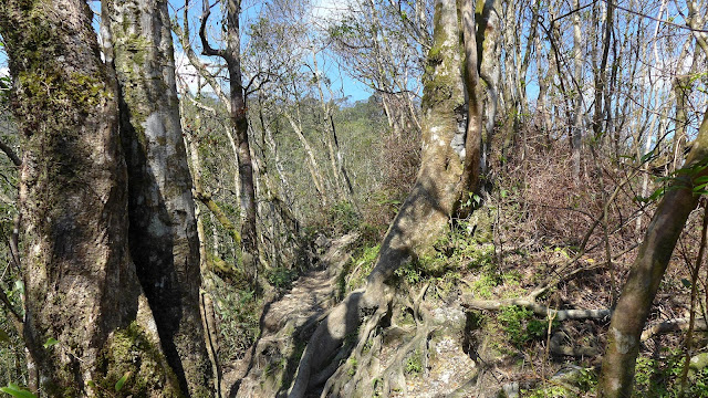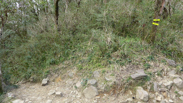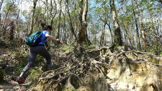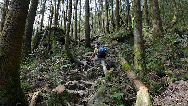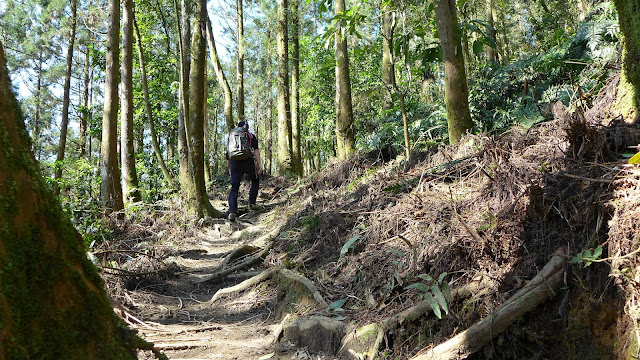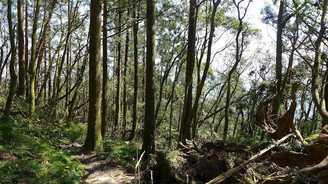但實際果然沒那麼好過,水龍頭之後開始爬升變得明顯,雖不至於超陡,但也是稍有陡度且持續,到最高越嶺點2.7K路程中,只有一段不長的平緩稜可以輕鬆走。