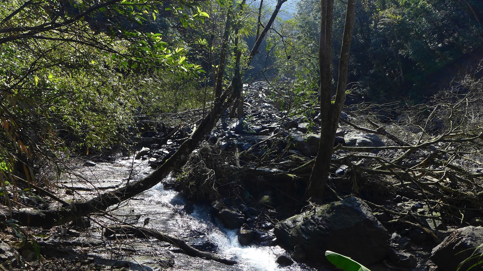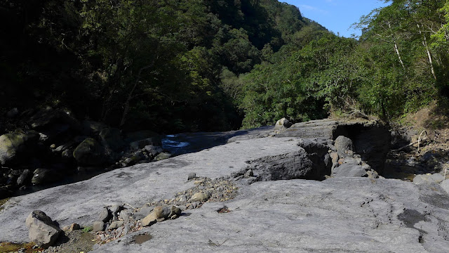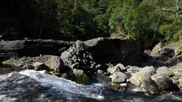 沿著產道向上,去年經過蘇迪勒的肆虐後,中坑溪和滿月圓的河道直到現在依然慘不忍睹,沿中坑溪走滿怖石塊、斷枝的河床,崩塌的山壁,不知姐妹瀑布是否安好,沿產道向上看到第一個叉路口,先取右往姐妹瀑布。