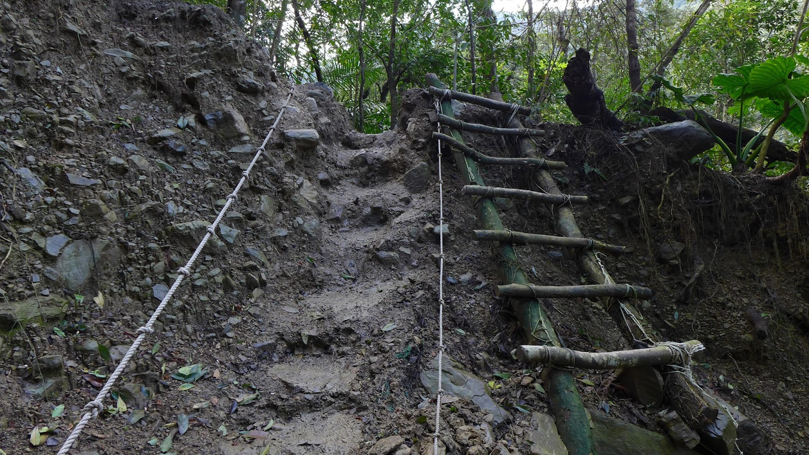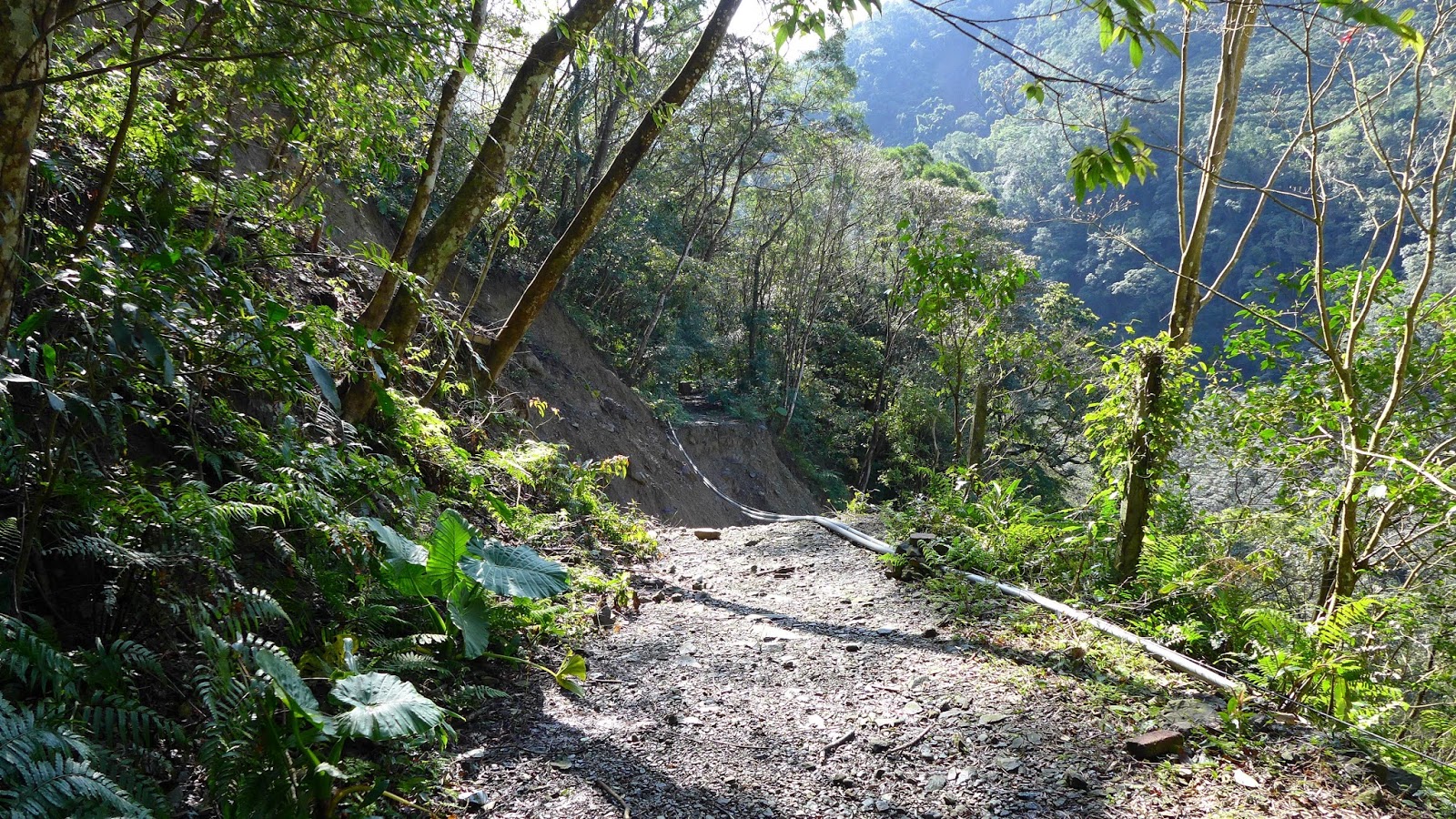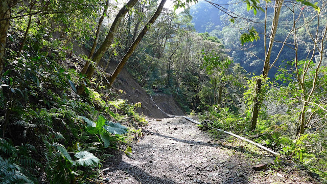 回到產道入口再往上另一處叉路,一樣取右,左往逐鹿山不取,原本是一路平緩的步道,現今也是不少崩坍,其中一塊大範圍崩落區是2012年蘇拉颱風造成的。