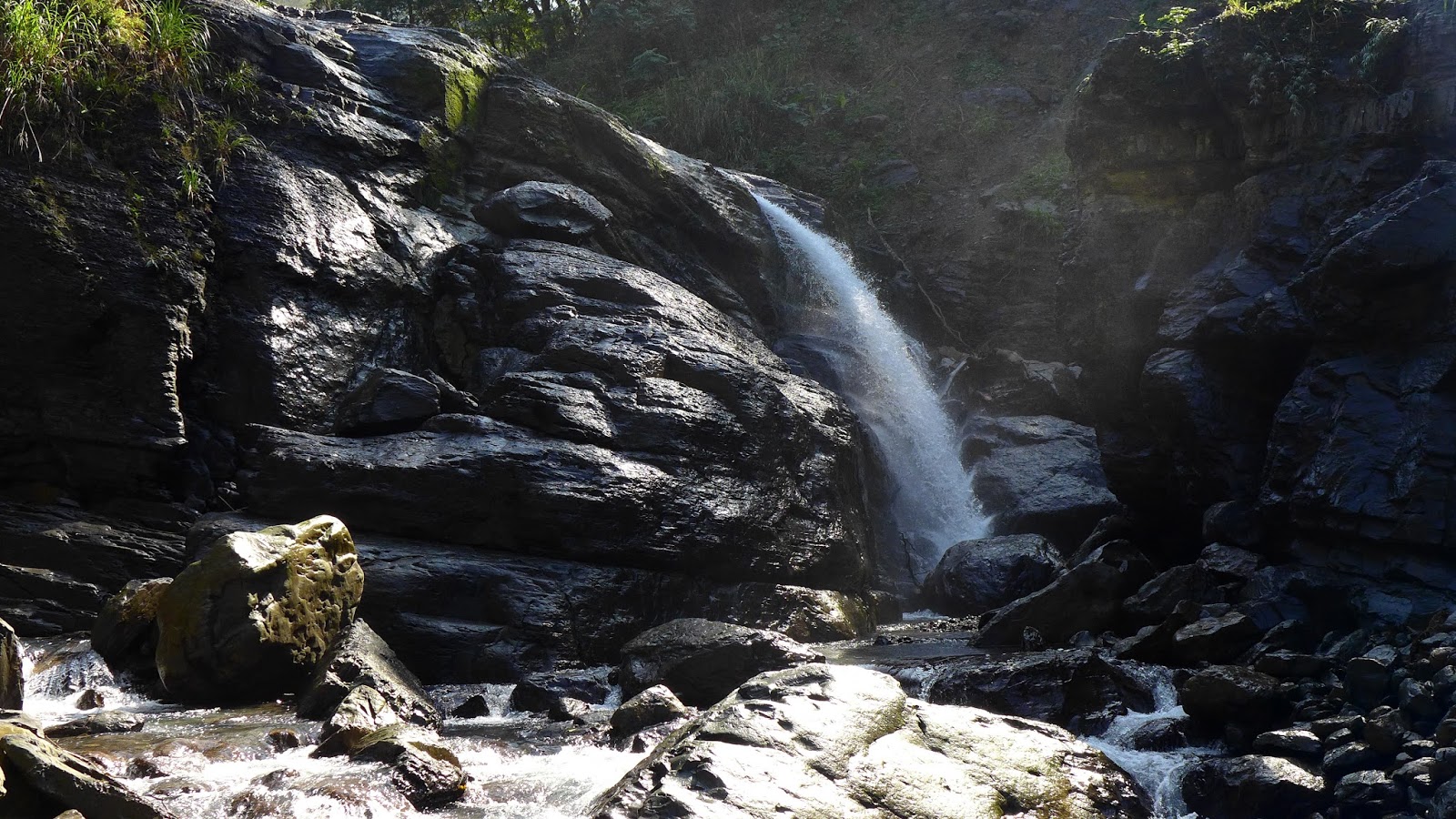 心靈谷為一座大石盤,以往下切下來直接就到上面了,現在則則因地形改變必須想辦法越過去,石磐盡頭就是姐妹瀑布瀑頂。