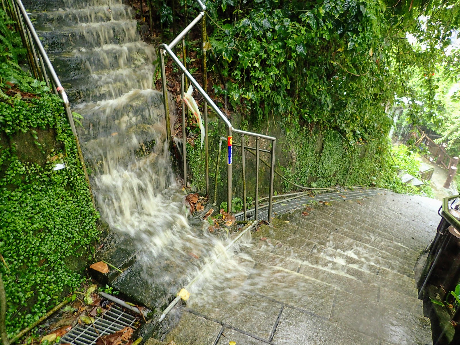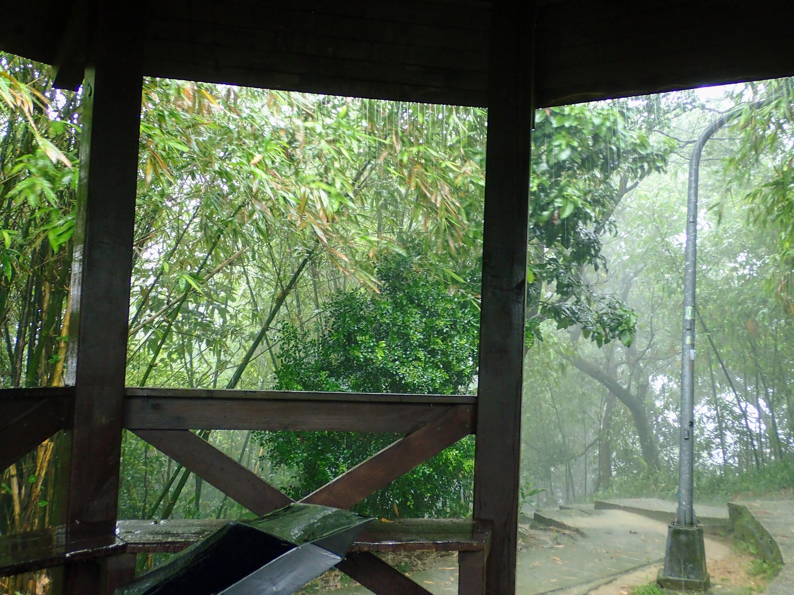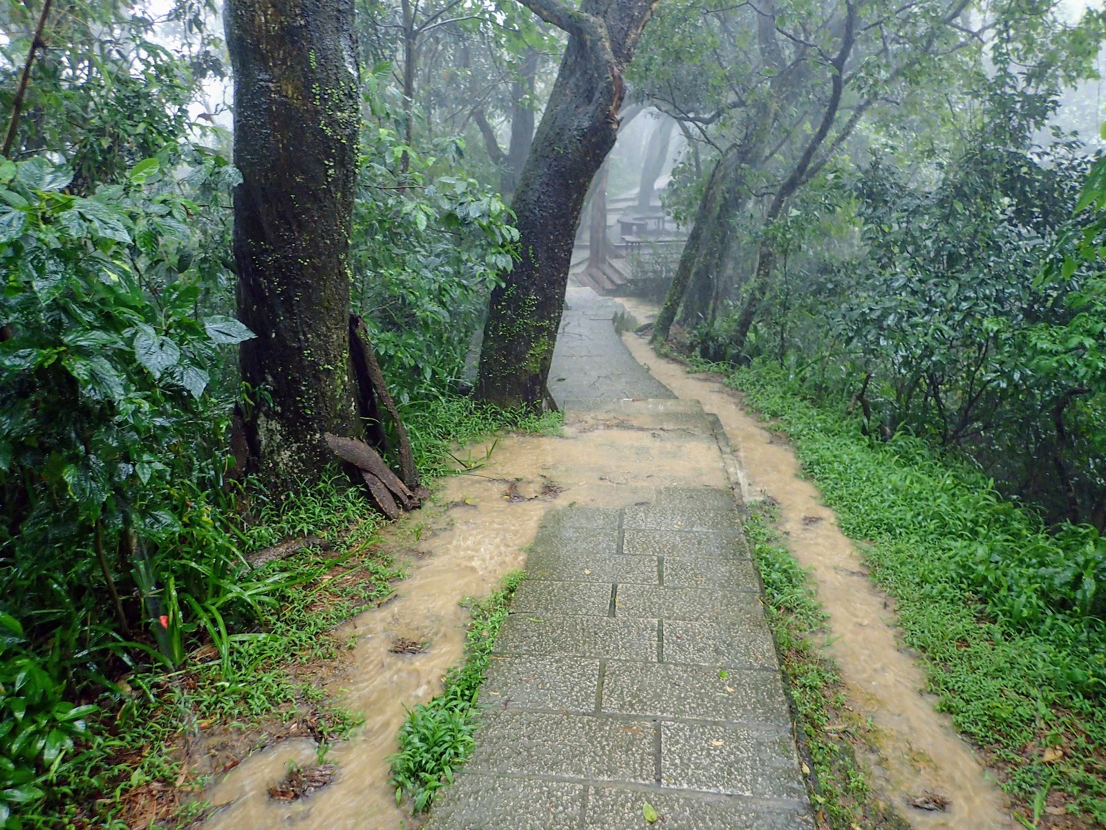 決定續往仙跡岩, 瞬間傾盆大雨毫不客氣的灌頂, 陡上爬階梯時感覺心臟無力喘不過氣, 緊拉著旁邊鐵扶手深怕昏厥倒下, 每走一步就停下休息等呼吸心跳平穩, 雨瘋狂打靠著意志力撐, 癱軟無力好不容易爬到涼亭, 休息片刻後這才恢復正常, 帶著閃電雷聲的暴雨沒停歇的感覺, 走吧不能停留, 要趕緊回家....