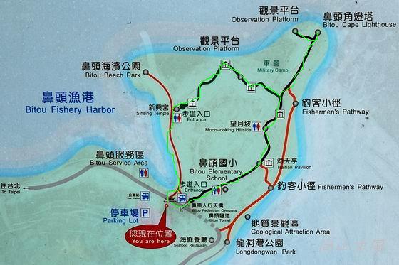 在走完小錐麓後時間還早, 便往鼻頭角方向去, 這鼻頭角步道約3.5km長, 多年前已走過了但當時沒有走去燈塔處, 這次就要來完成吧 ! 停好車走上天橋往鼻頭國小方向去, 下圖綠色的線就是我們走的路線