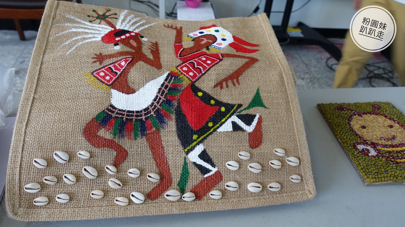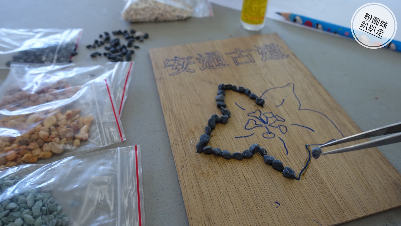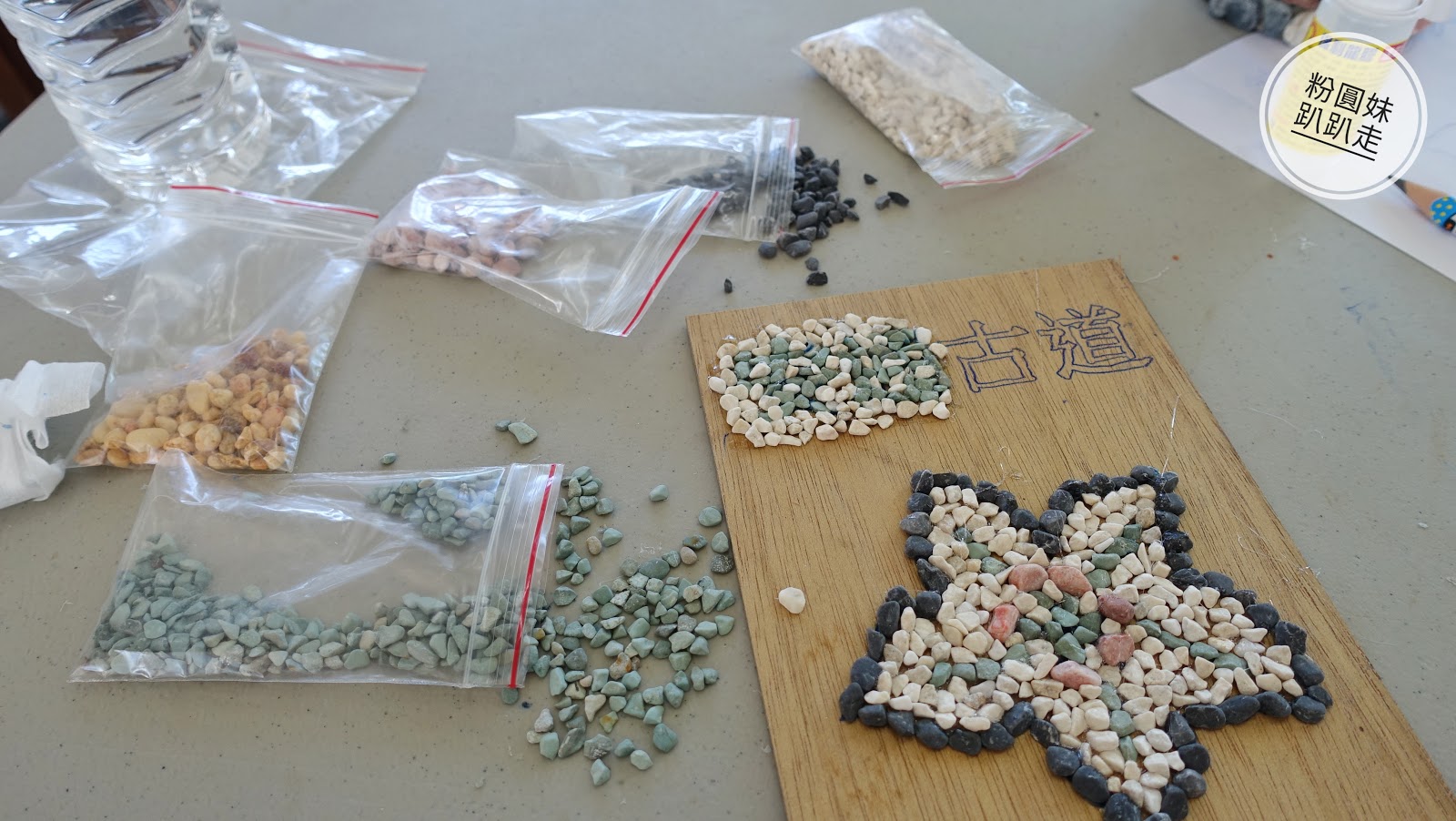 要利用小碎石頭拼貼成一幅畫作,對我們這些戶外咖,真的是十分考驗著耐性呀!我的眼睛都快變成鬥雞眼了,都還無法完成整幅作品,因此更加欽佩阿美族婦女的耐心與天生的藝術美感。