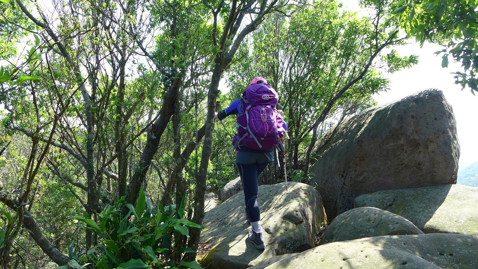 龍船岩為一平整大岩壁,一側45度另一側垂直峭壁,因外型像龍舟而得此稱呼,上去小心即可,難度並不高,景觀視野很棒,先把我們2個背包拿到下山方向那的空地擺著。