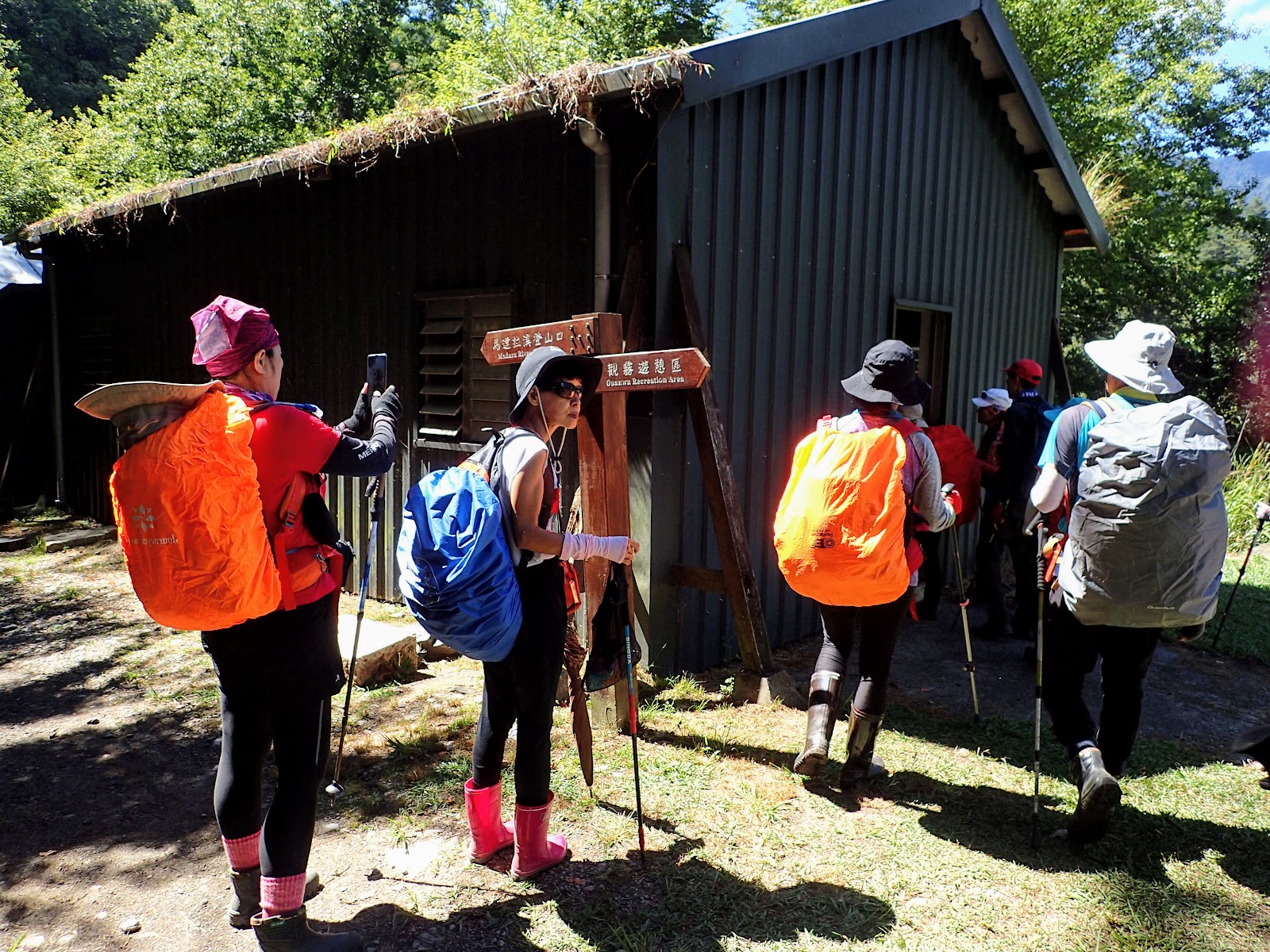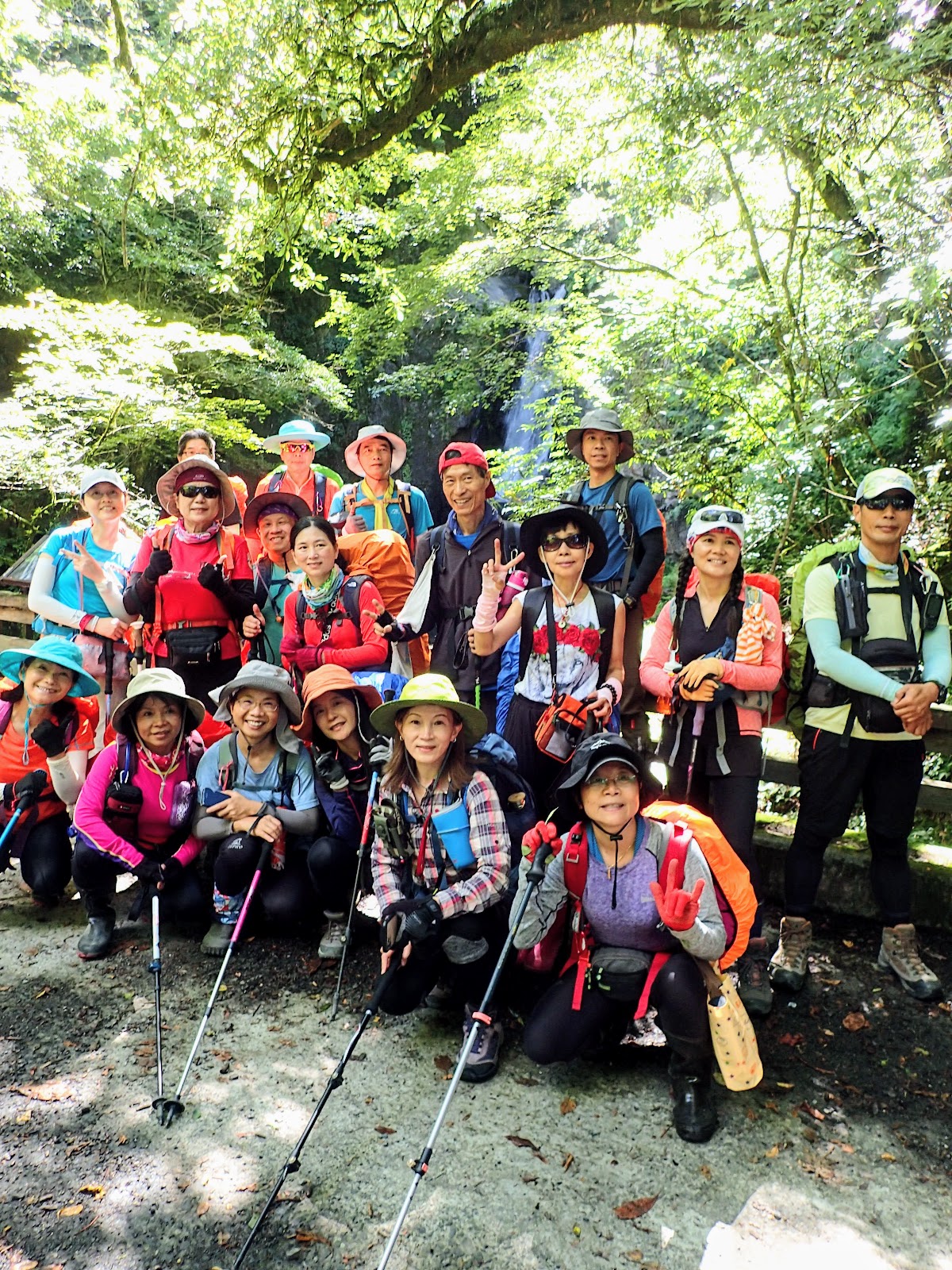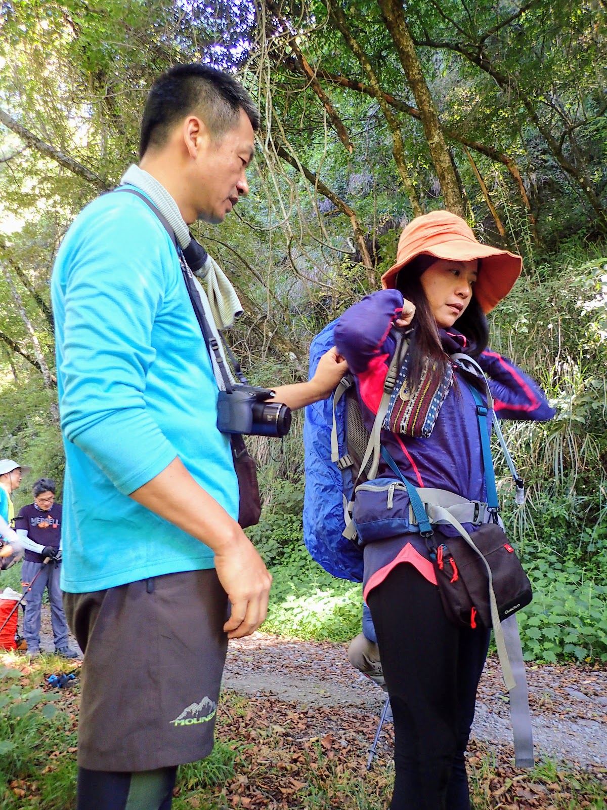 來到東線瀑布休息時, 陳教授幫同行山友調整背包