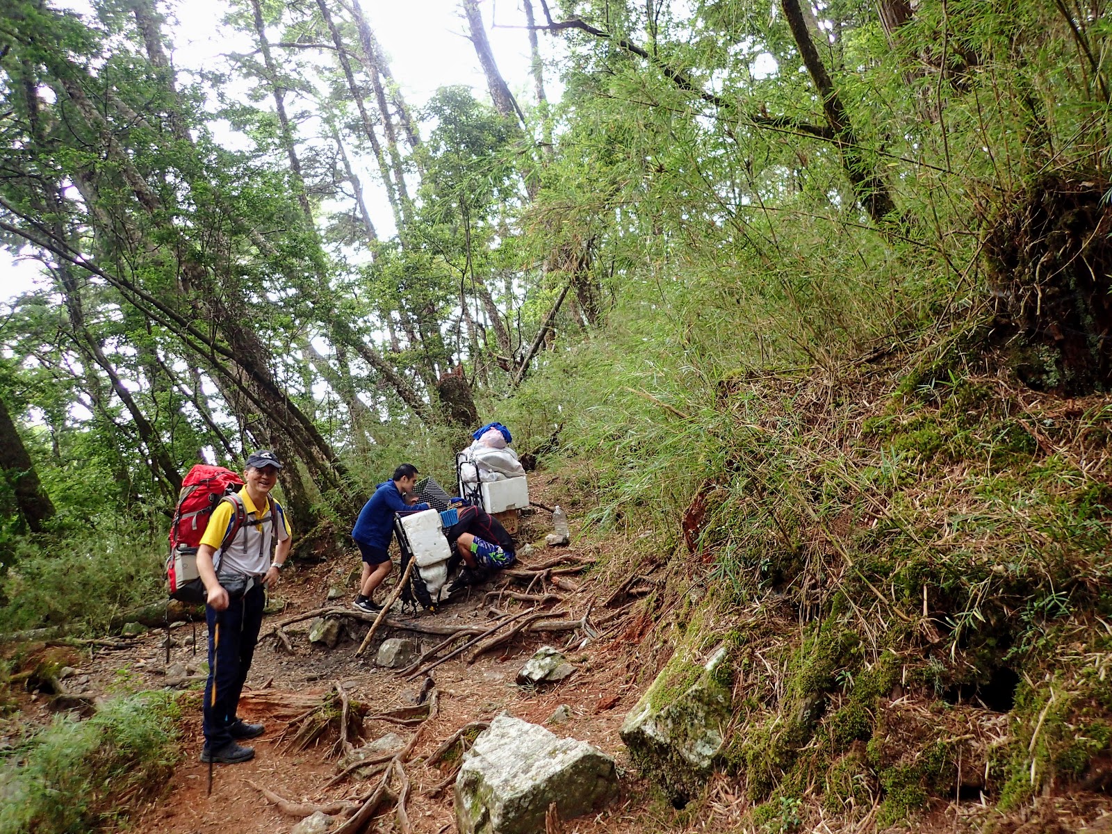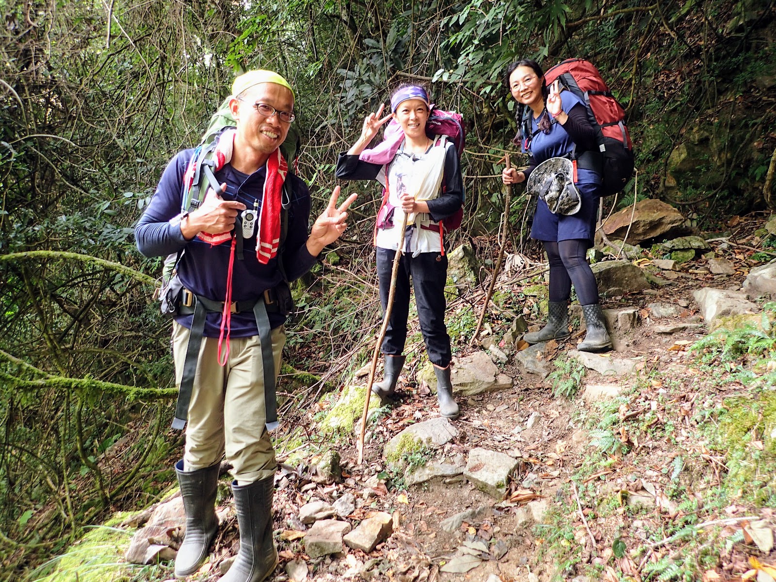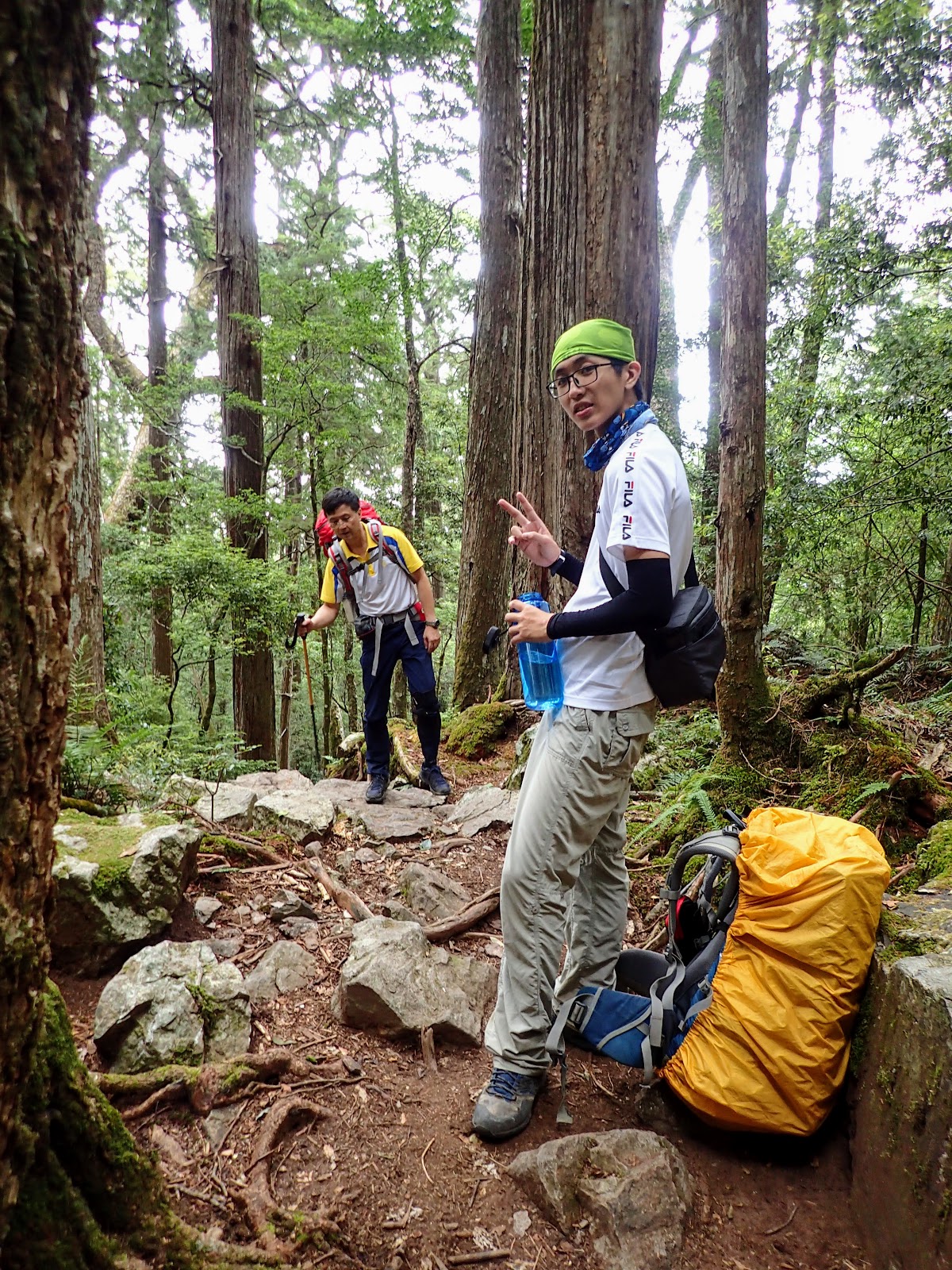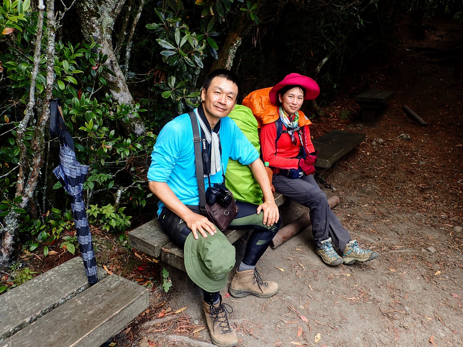 來到東線瀑布休息時, 陳教授幫同行山友調整背包