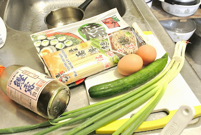 1. 把蔥(越細越好)、小黃瓜(開心就好)、紫菜(用剪得比較好)切成細絲