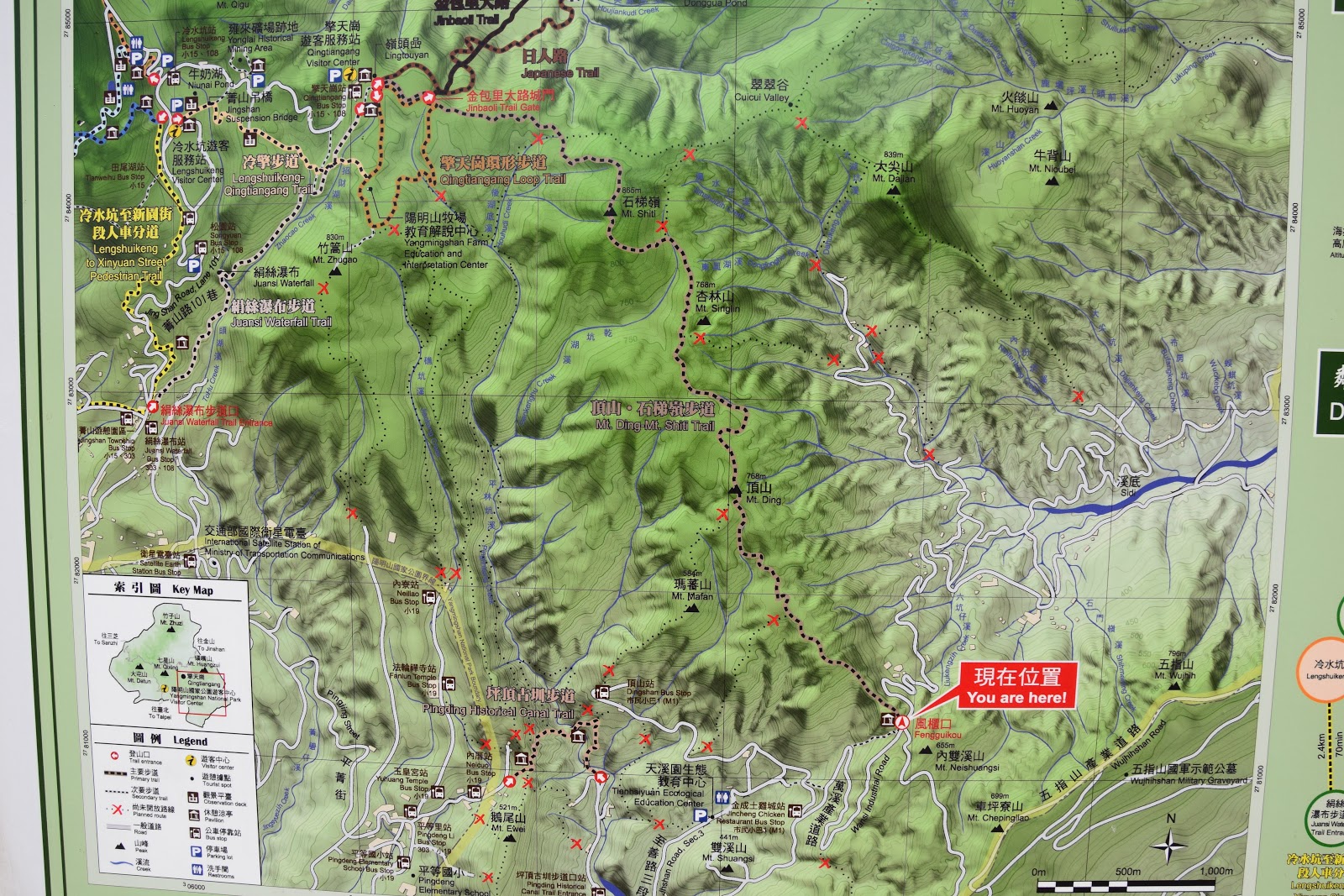 -花了點時間終於到達陽明山縱走的起點,淺棕色的路線就是今天要走的前半部份,看地形是都是沿陵線走,起伏不會太大