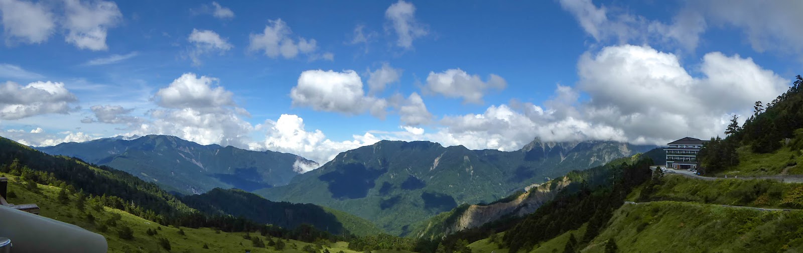 -右為松雪樓,台灣最高的旅館,較易認的從右到左為奇萊北峰,屏風山,左後方遠一點還會看到南湖大山及中央尖山