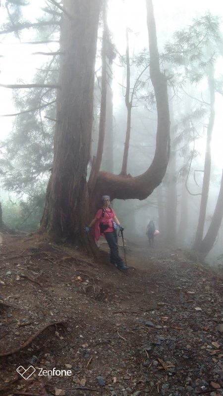 下山一路陡下,對膝蓋腿力是很大考驗,午後林中霧氣彌漫,另有一翻仙境意像,這棵大樹可比馬崙名樹,U型向上擋在路中,有此山是我開,一夫當關萬夫莫敵氣勢