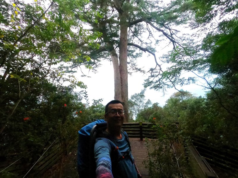 回程走斯可巴步道下山,16:55來到五葉松媽媽涼亭,高聳入雲樹體,薄霧中更顯壯闊,這可是八壯士的母親,謝謝您,百年來守護這一方水土....感恩