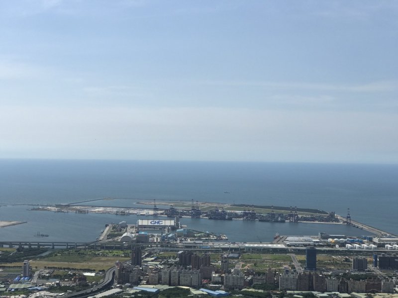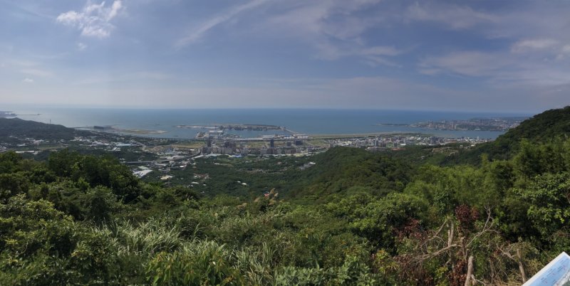牛港稜山登山步道全景,拍下了林木蓊鬱與湛藍的台北港景致。