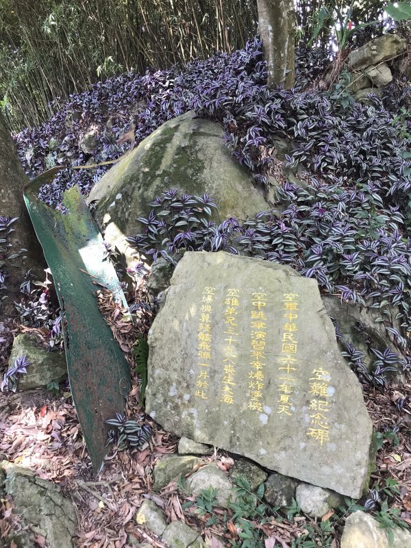 牛港稜山登山步道途中的空難紀念碑與機身殘骸。上頭寫著:民國六十一年夏天,空軍跳傘演習不慎墜毀,空軍弟兄三十九人喪生大海。因此而立碑紀念。紀念碑僅刻著簡單的文字說明,一旁的紫葉圍繞著紀念碑,更增添了一種淒涼感,當時在這裡駐足觀望了好久,心中有種平靜而微微沉重之感。