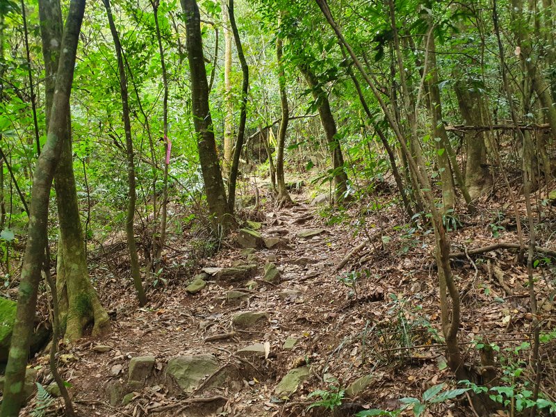 到這裡為止都是平緩向上的碎石路,在過不久會看到山友綁的布條,是捷徑但是比較陡,不好走。