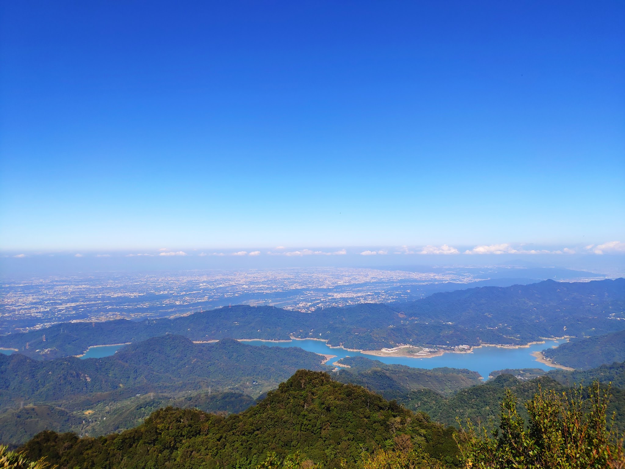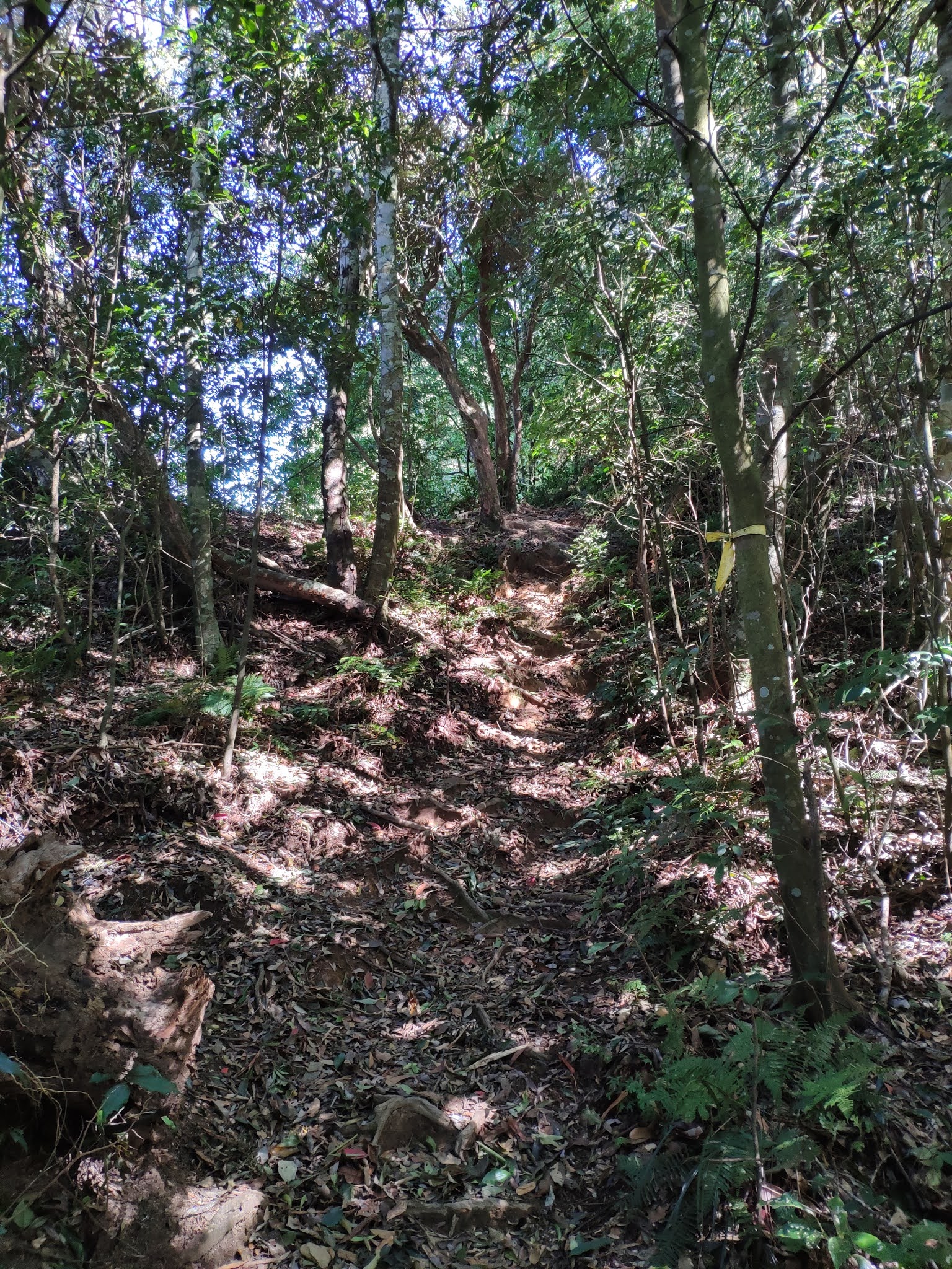 迷失在森林中一陣子之後,便開始到樹根路原始林,仍然一路陡上,加上沒有展望和標示公里的木樁,爬起來心很累,不知道前方還有多遠的路程。就在快要絕望的時候,旁邊看到石門水庫了!心想:該不會快到了吧!再走了數十分鐘,終於抵達山頂,是一小塊裸露岩石,可以遠眺附近的那結山和內鳥嘴山。