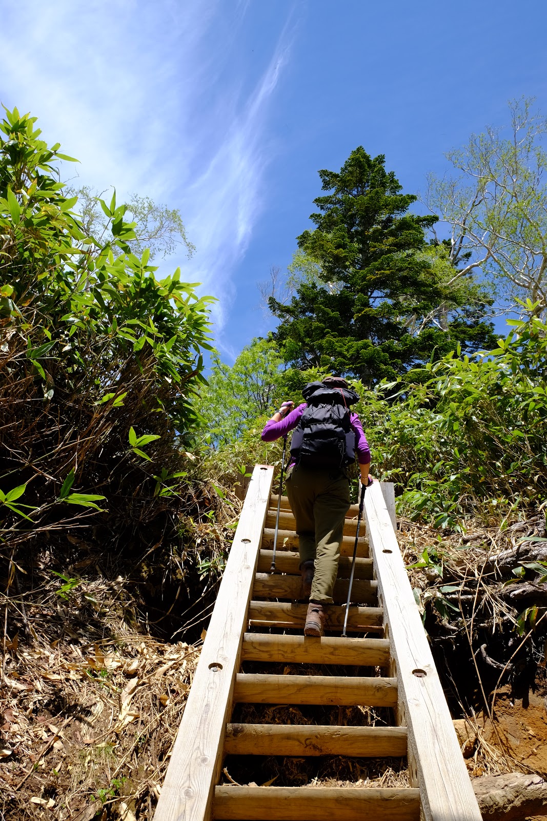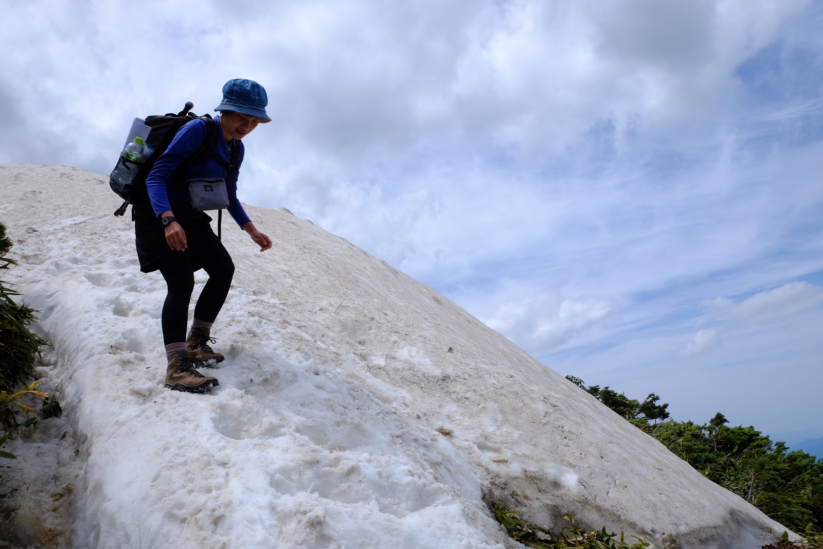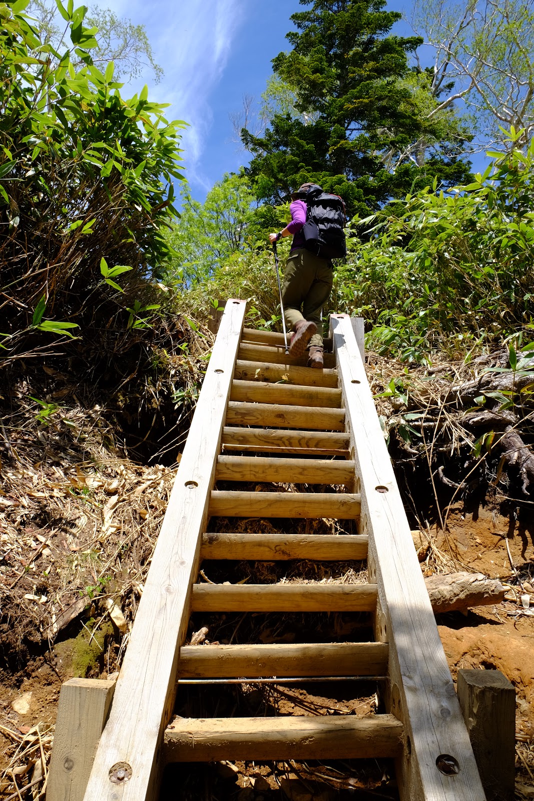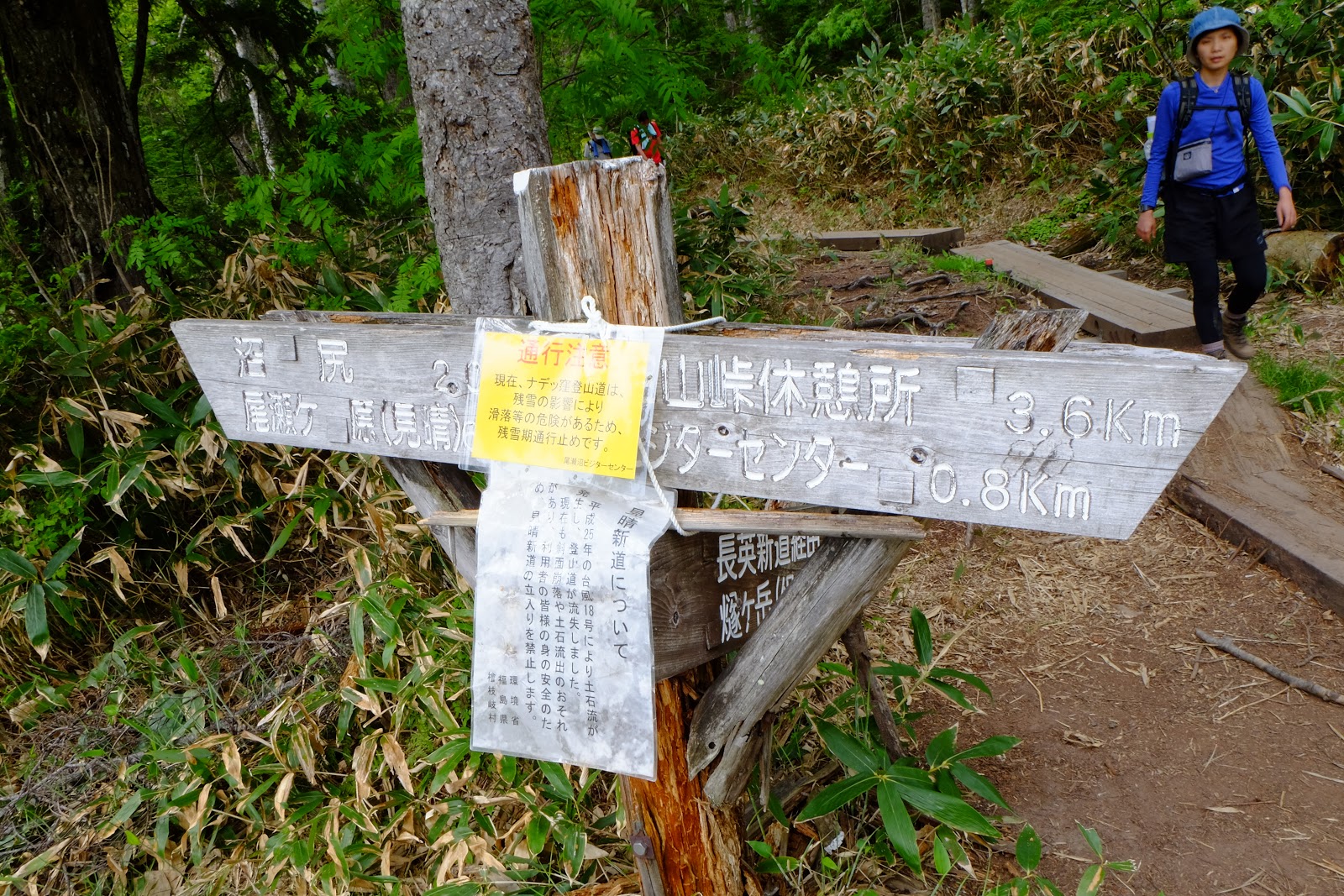 解決好民生問題後返為叉路口往燧ヶ岳方向前進,燧ヶ岳是日本東北地方最高峰2,356m,是日本百名山之一(=台灣百岳的意思)。燧ヶ岳有兩個基點,分別是柴安嵓2,356m、俎嵓2,346m。要從尾瀬登上燧ヶ岳一般來說有有兩個經典路線,一個是從長蔵小屋出發的長英新道(路程3:30)、一個是從見晴十字路出發的見晴新道(路程4:00),這次六月上旬時見晴新道因為殘雪封閉,所以只能採長英新道上下山,有時候見晴新道也只能上山無法下山,規劃行程需要確認好所有山區資訊,避免像我們這次臨時更改路線,時程大delay…