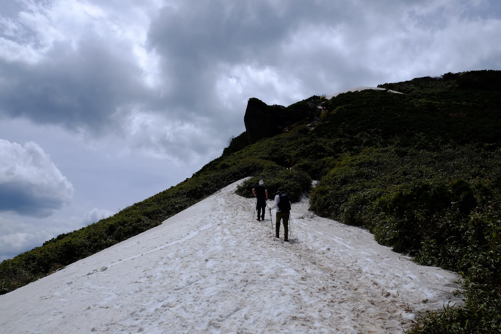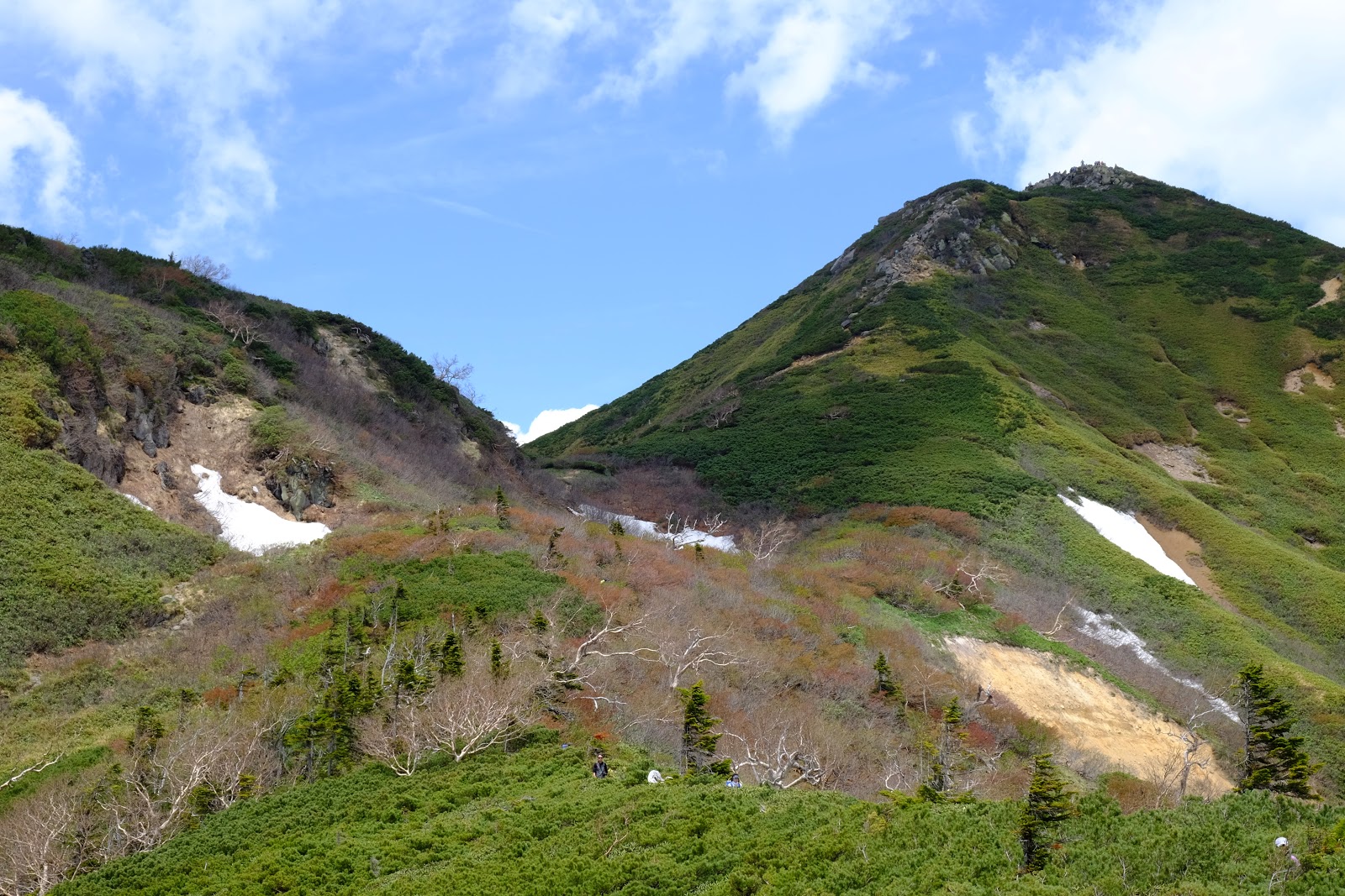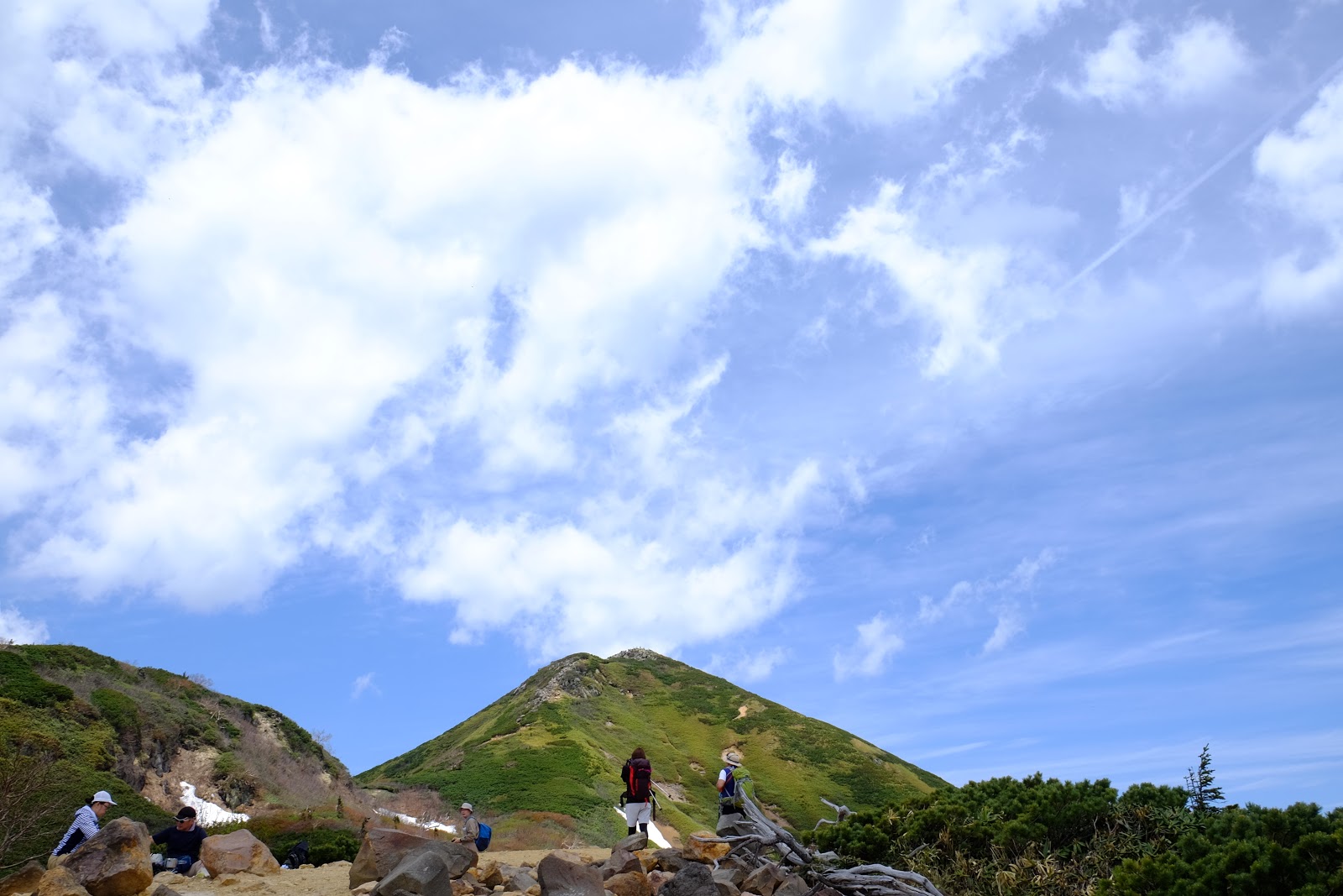解決好民生問題後返為叉路口往燧ヶ岳方向前進,燧ヶ岳是日本東北地方最高峰2,356m,是日本百名山之一(=台灣百岳的意思)。燧ヶ岳有兩個基點,分別是柴安嵓2,356m、俎嵓2,346m。要從尾瀬登上燧ヶ岳一般來說有有兩個經典路線,一個是從長蔵小屋出發的長英新道(路程3:30)、一個是從見晴十字路出發的見晴新道(路程4:00),這次六月上旬時見晴新道因為殘雪封閉,所以只能採長英新道上下山,有時候見晴新道也只能上山無法下山,規劃行程需要確認好所有山區資訊,避免像我們這次臨時更改路線,時程大delay…