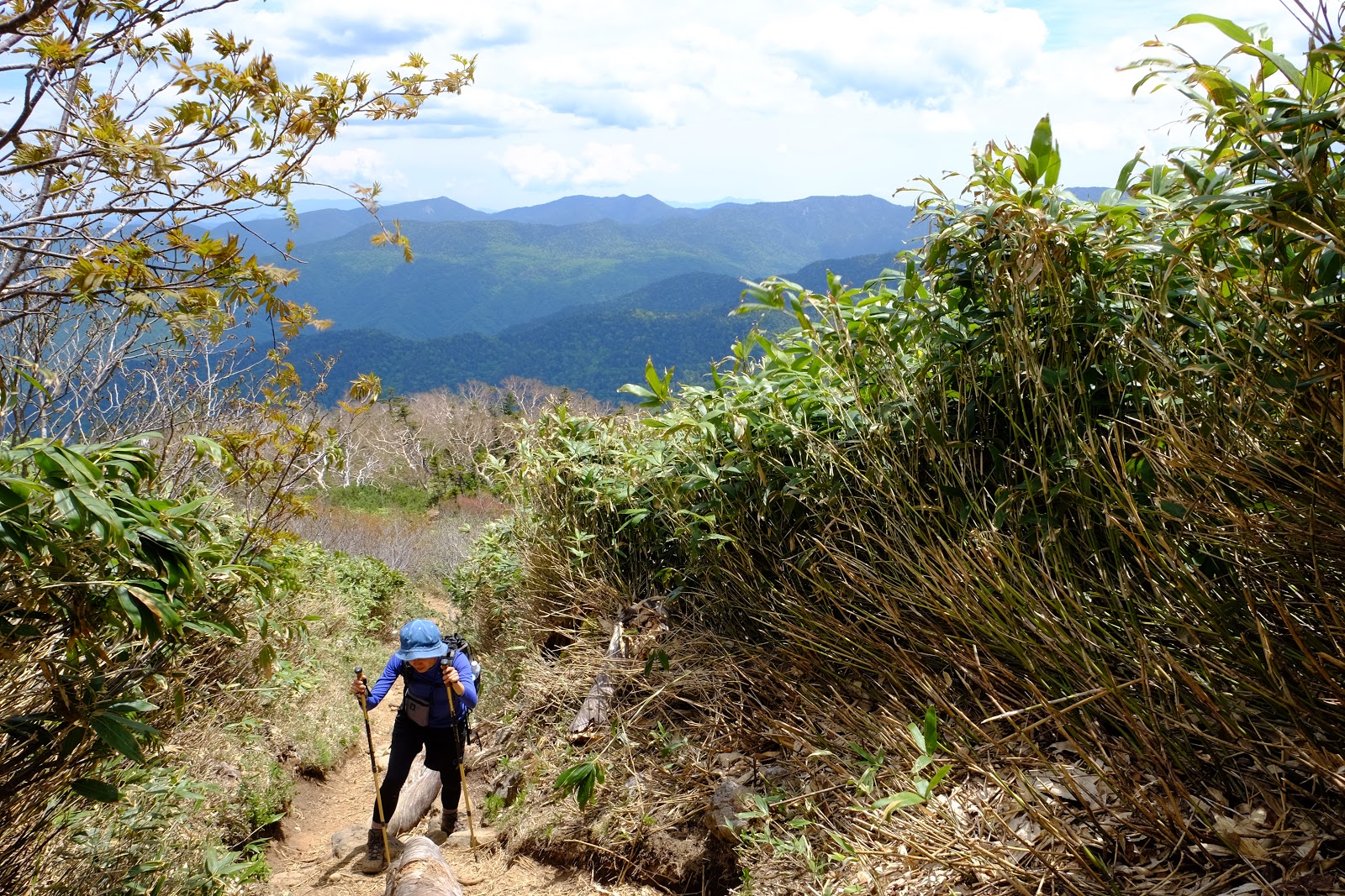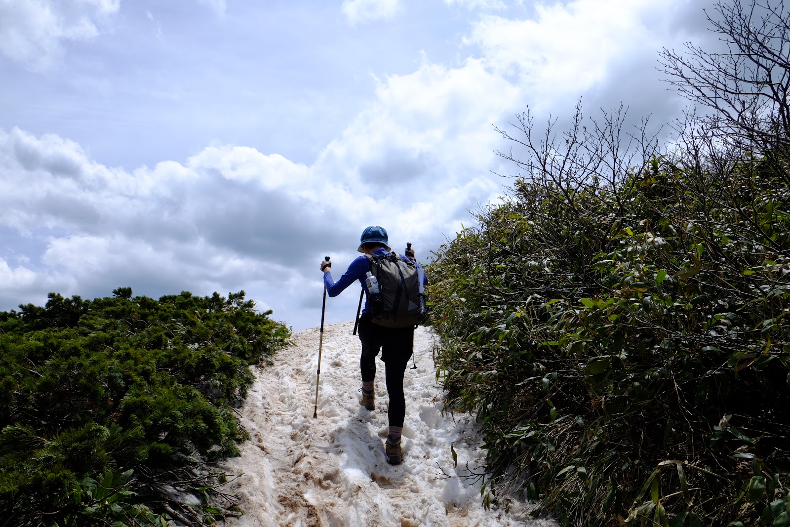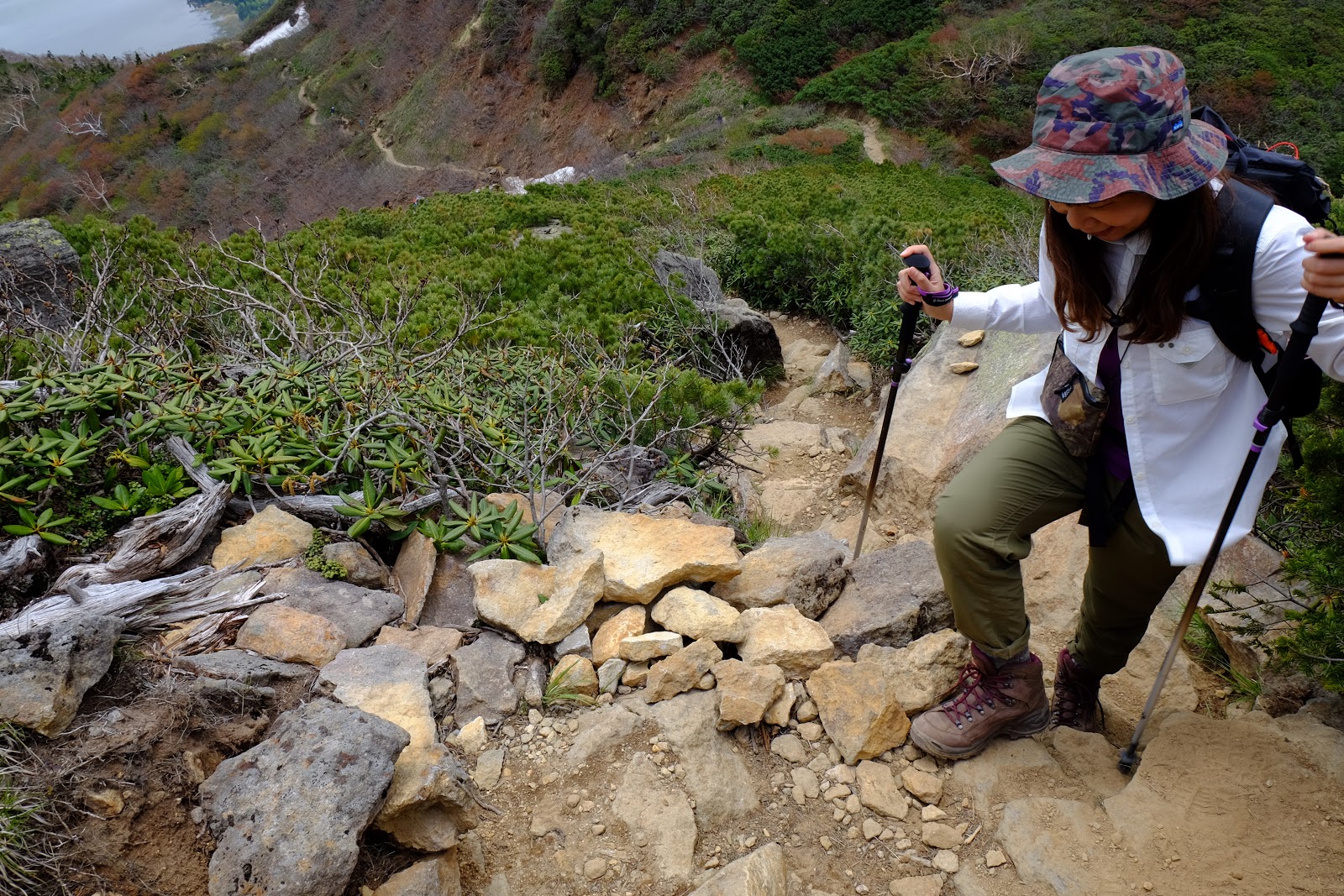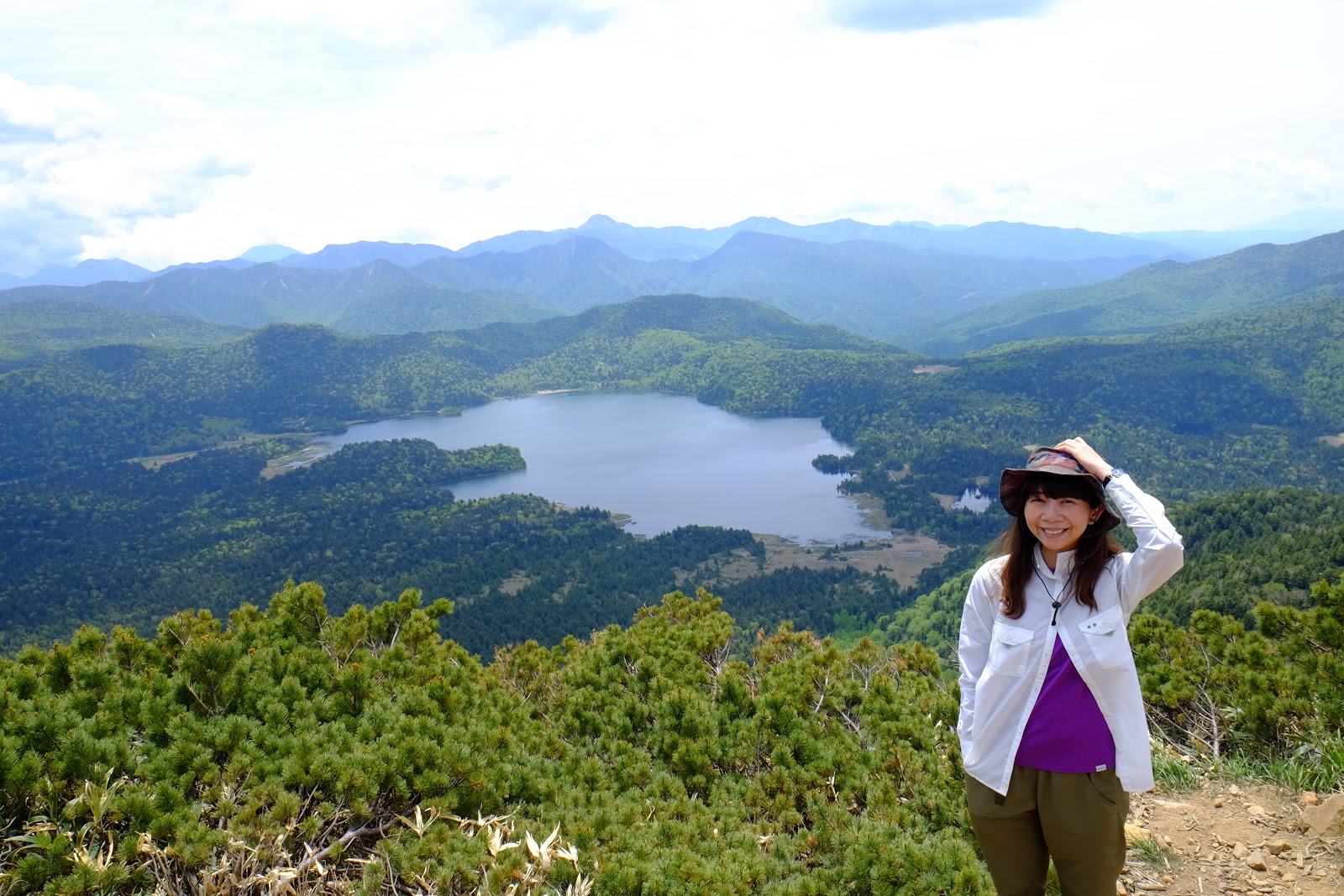 解決好民生問題後返為叉路口往燧ヶ岳方向前進,燧ヶ岳是日本東北地方最高峰2,356m,是日本百名山之一(=台灣百岳的意思)。燧ヶ岳有兩個基點,分別是柴安嵓2,356m、俎嵓2,346m。要從尾瀬登上燧ヶ岳一般來說有有兩個經典路線,一個是從長蔵小屋出發的長英新道(路程3:30)、一個是從見晴十字路出發的見晴新道(路程4:00),這次六月上旬時見晴新道因為殘雪封閉,所以只能採長英新道上下山,有時候見晴新道也只能上山無法下山,規劃行程需要確認好所有山區資訊,避免像我們這次臨時更改路線,時程大delay…