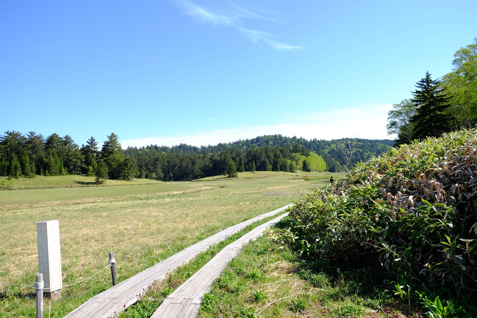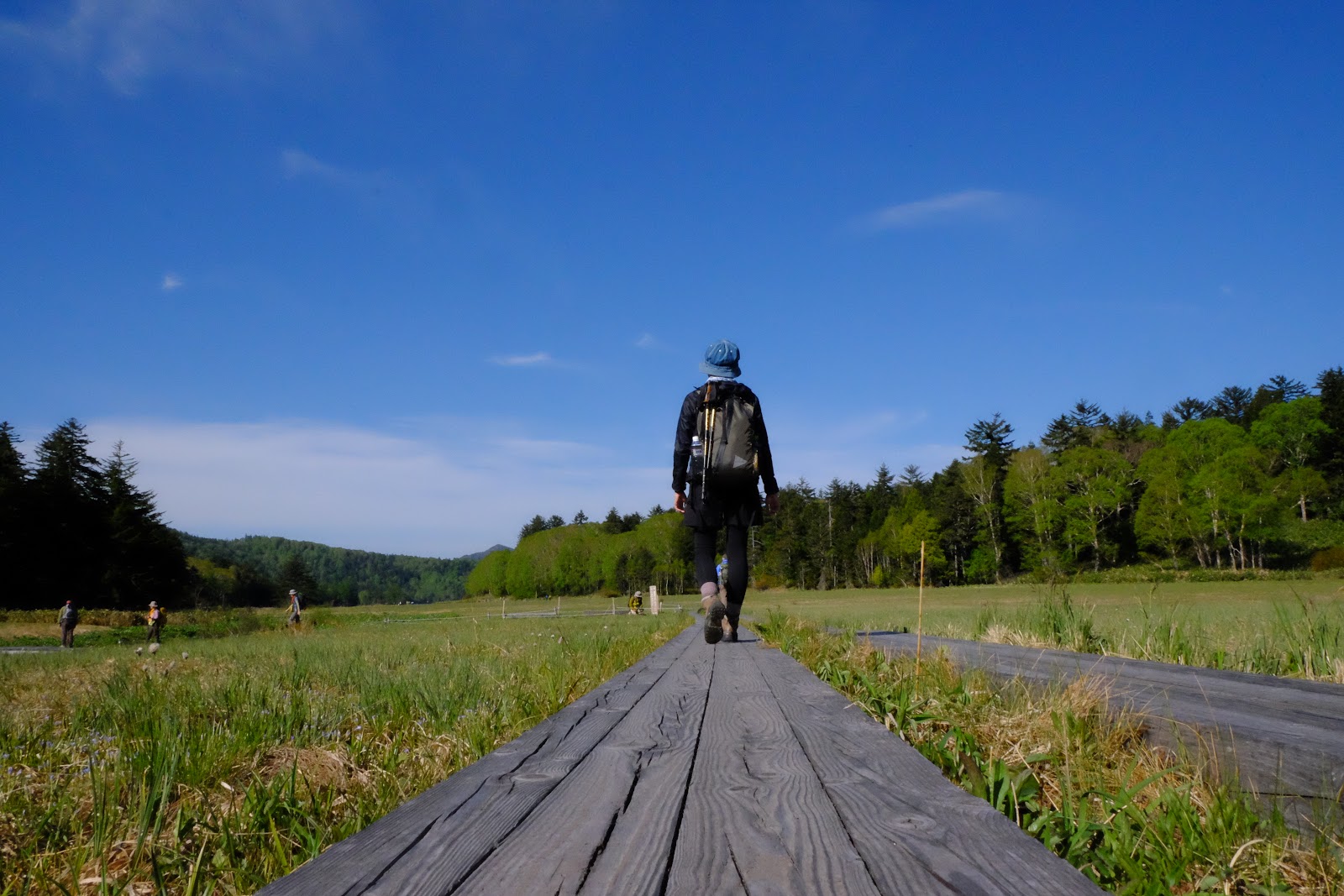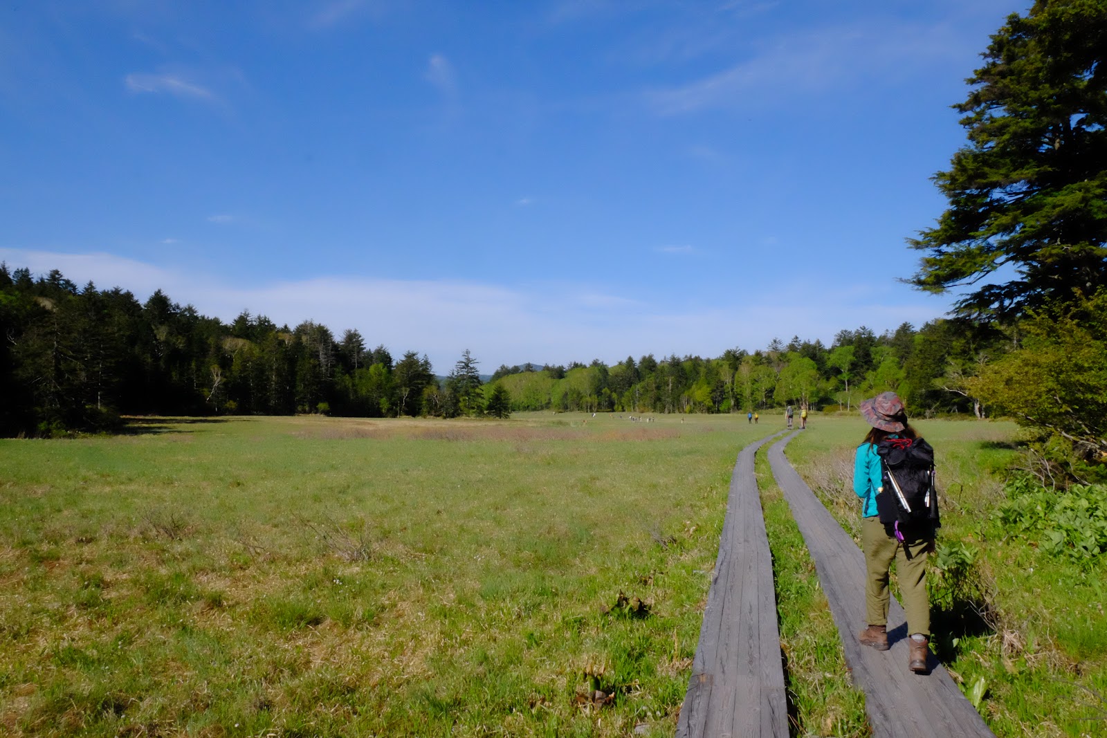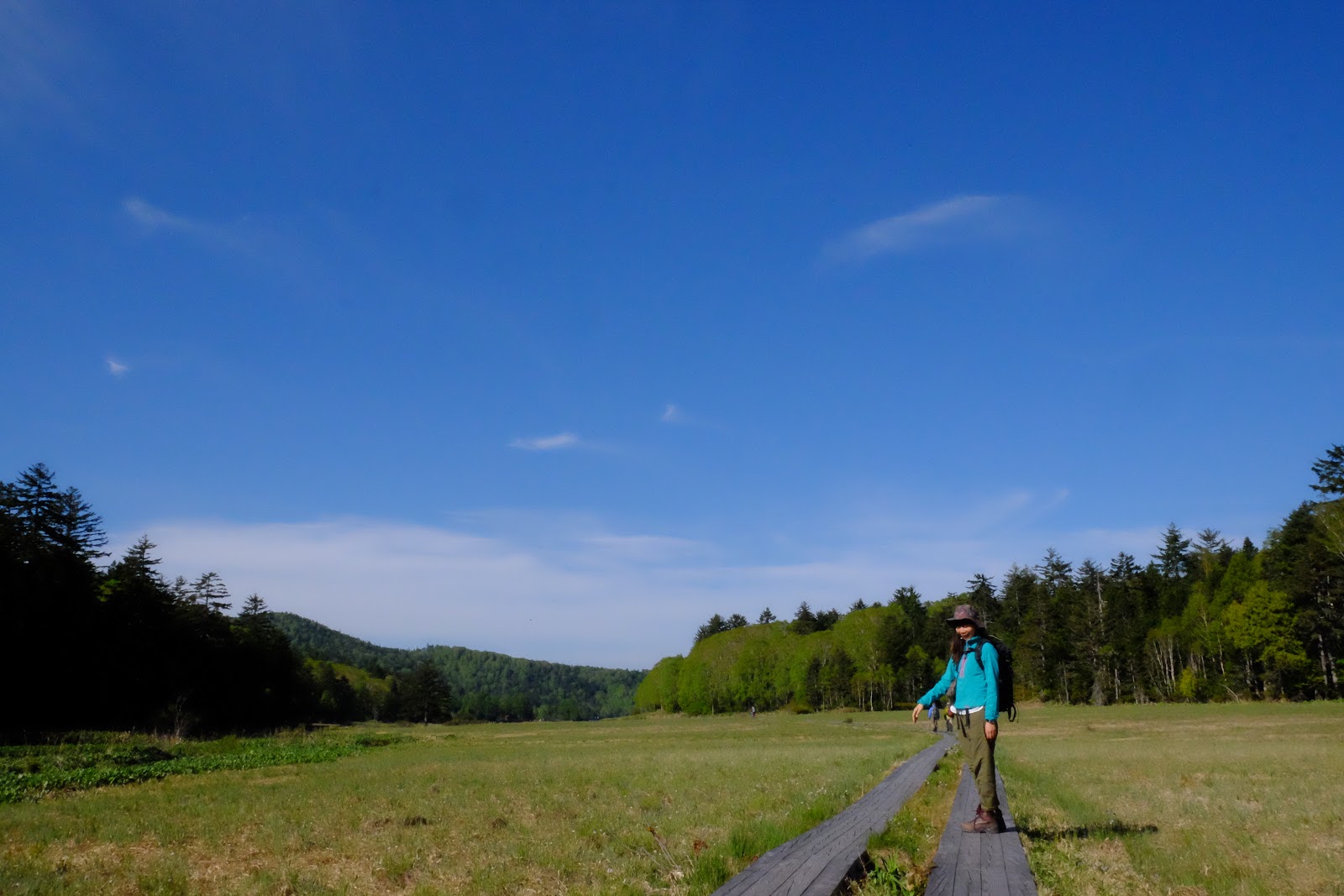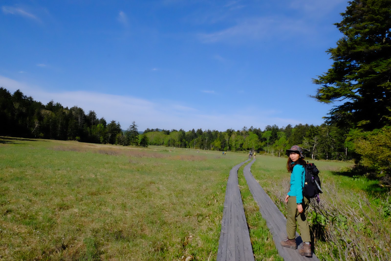 ↑今天的天氣很棒、陽光耀眼,大江濕原趁著萬里無雲的藍天非常美麗,大家走到這裡都放慢速度,用散策的方式慢慢的照相聊天,但是大家都很守法,雖然附近的草地都是乾爽的,也沒有人離開棧道一步走去別的地方拍照。如果場景換到某處,應該會有很多不受控的山友吧~