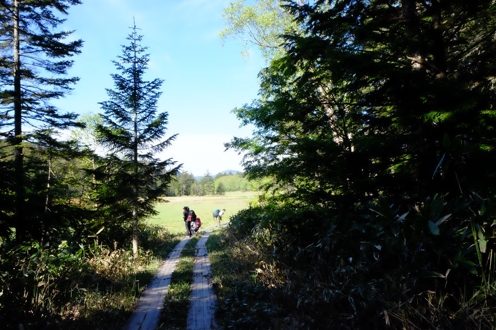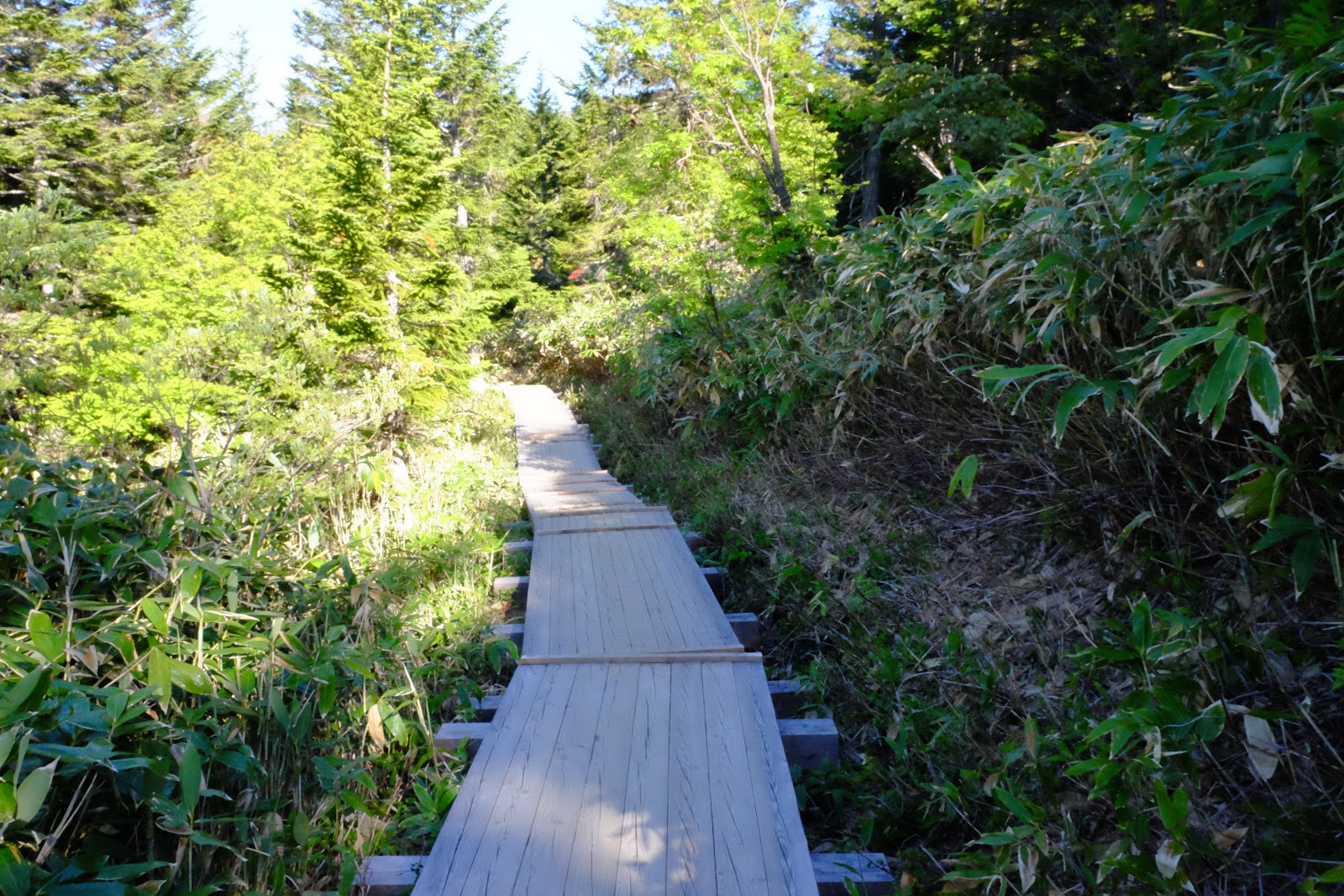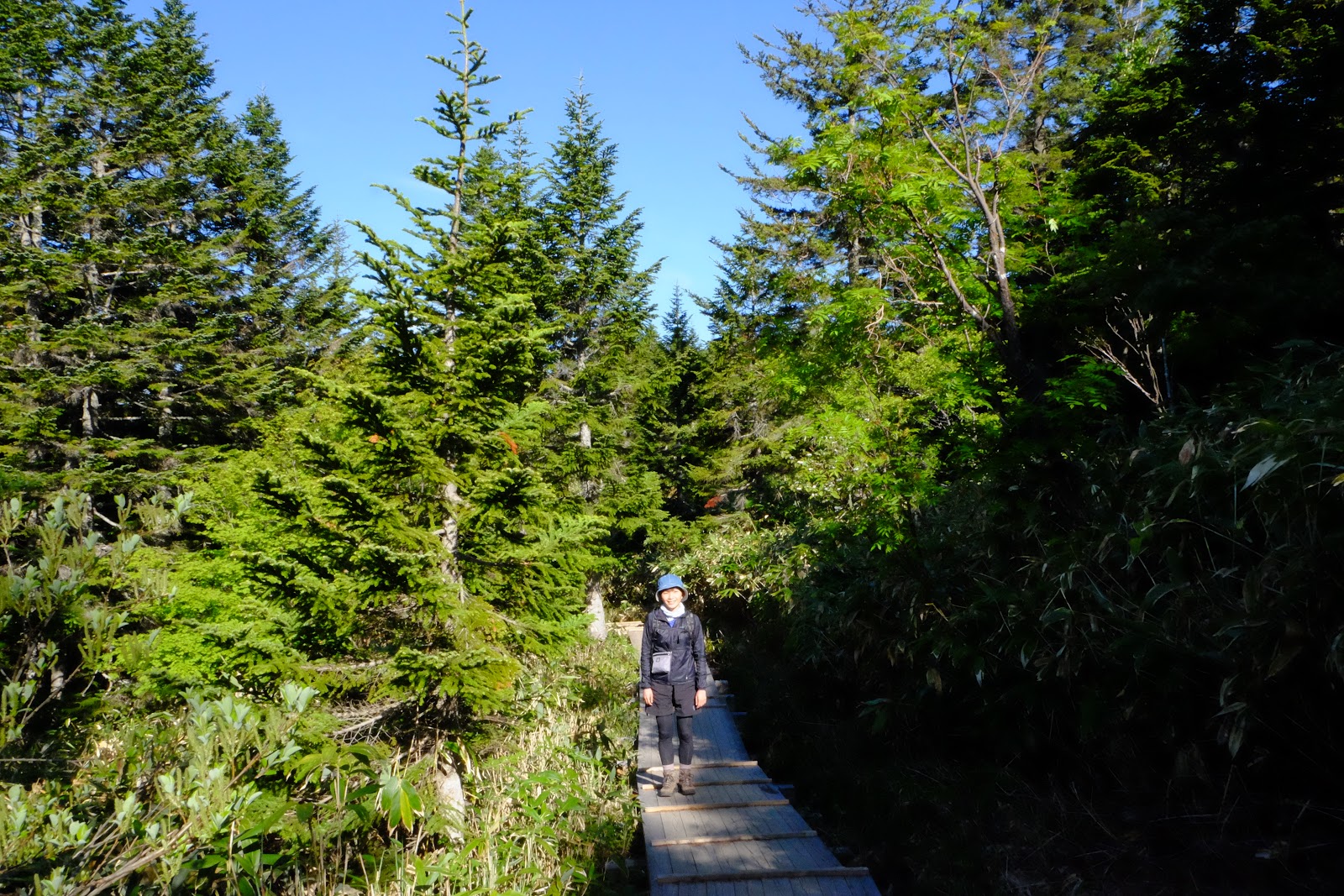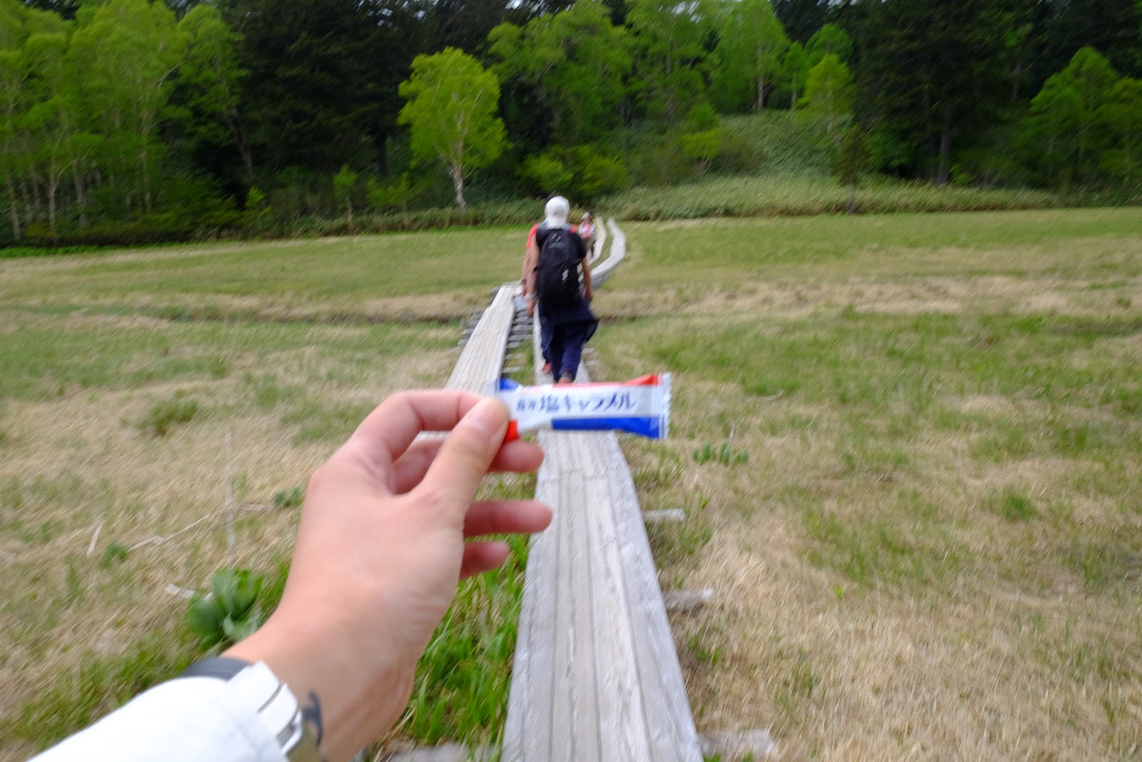下山後遇到一群日本男孩也是前往同一個方向。原本他們也是計畫從見晴新道下山,因為見晴封路這下要多走3小時的路大家都只有苦笑。他們聽到我們從台灣來都超驚訝的,可能這裡真的不是很多外國人。走在木棧道上隨手拍了送我糖果的日本男孩帥氣的背影,有點模糊可惜了。接下來就要去體驗日本的山小屋喔!