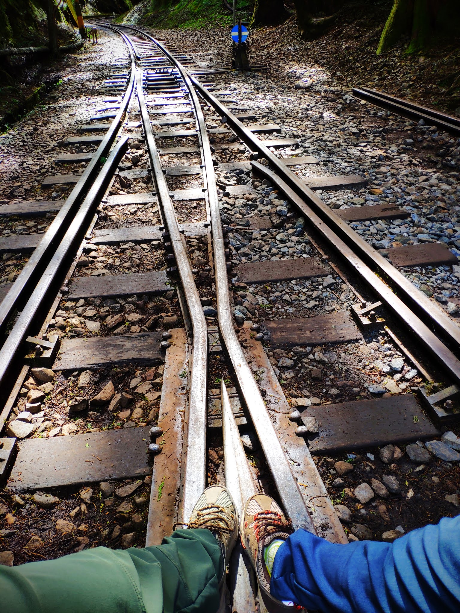 阿里山園區內有遠近馳名的眠月線,但是因為需要申請,而且有人數管制,我和麻糬選擇去爬阿里山山脈最高峰——大塔山。前2公里塔山步道沿著鐵軌而建,一路上高低起伏,山中魔幻森林彷彿世外桃源,各種奇形怪狀的檜木如遠古巨獸,在一旁伺機而動,深怕靠近時會突然伸出魔爪,被吞噬其中。如果不想耗費體力的話,可以先沿著眠月線的鐵軌行走,欣賞森林的奇幻景致,在約2公里處經過眠月線與祝山線的交會點後,會看到一個木平台,這時候要記得往木平台的方向前進,會有塔山步道的標示牌,需要一路向上攀登。