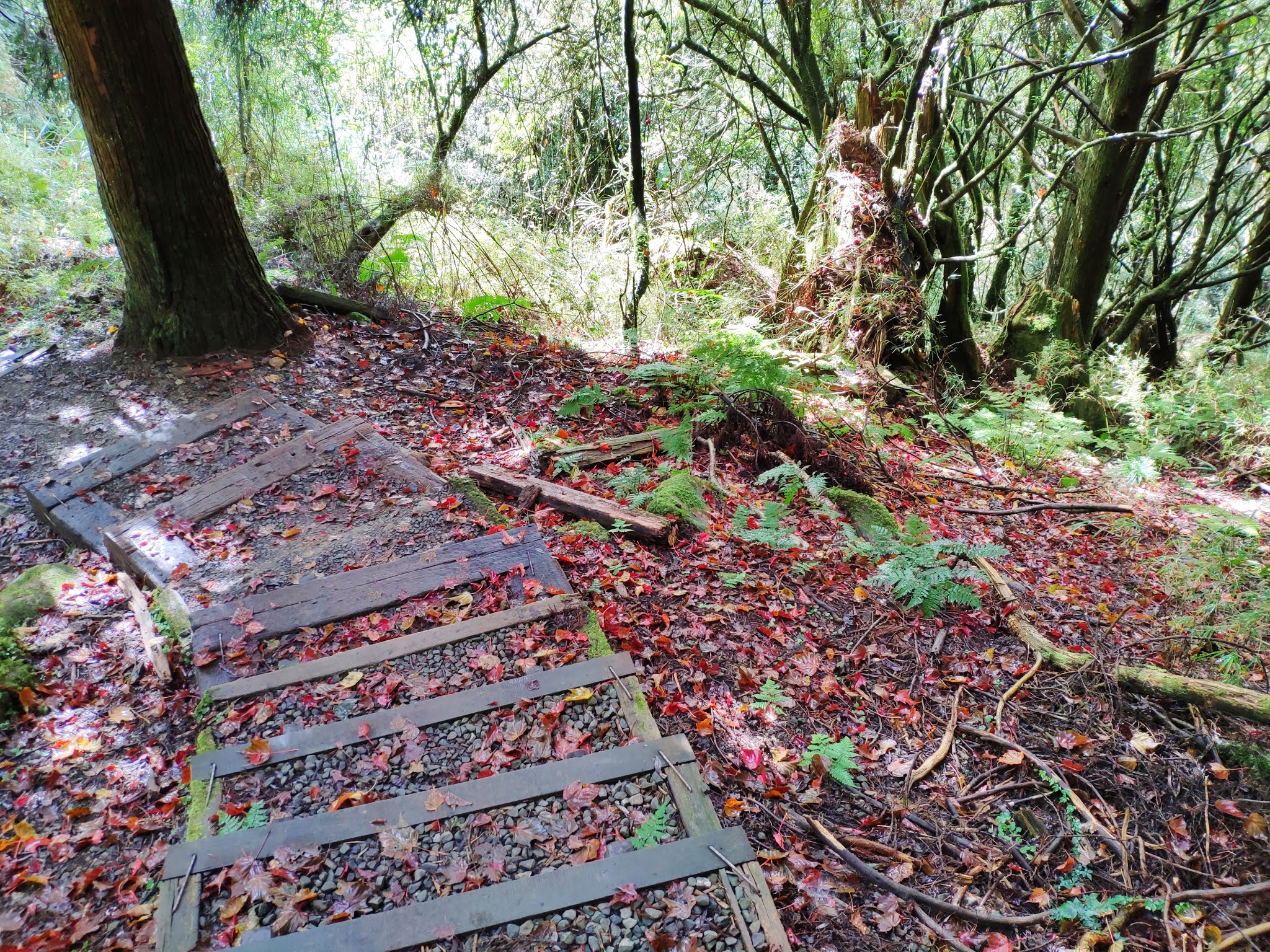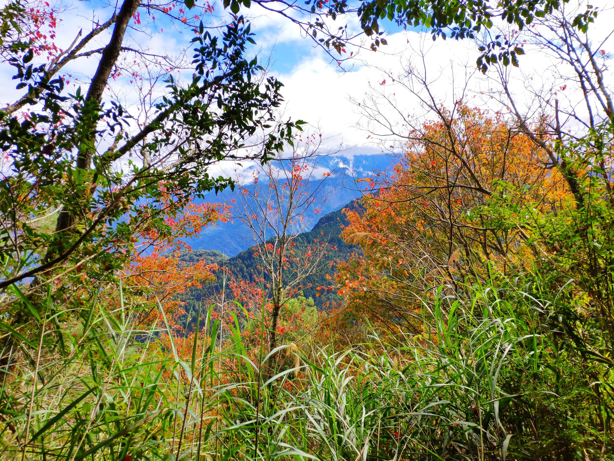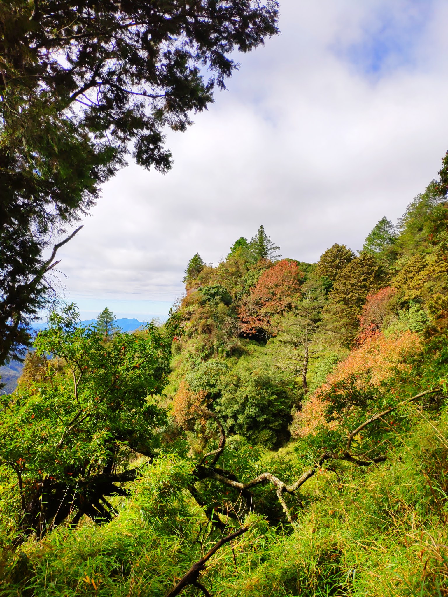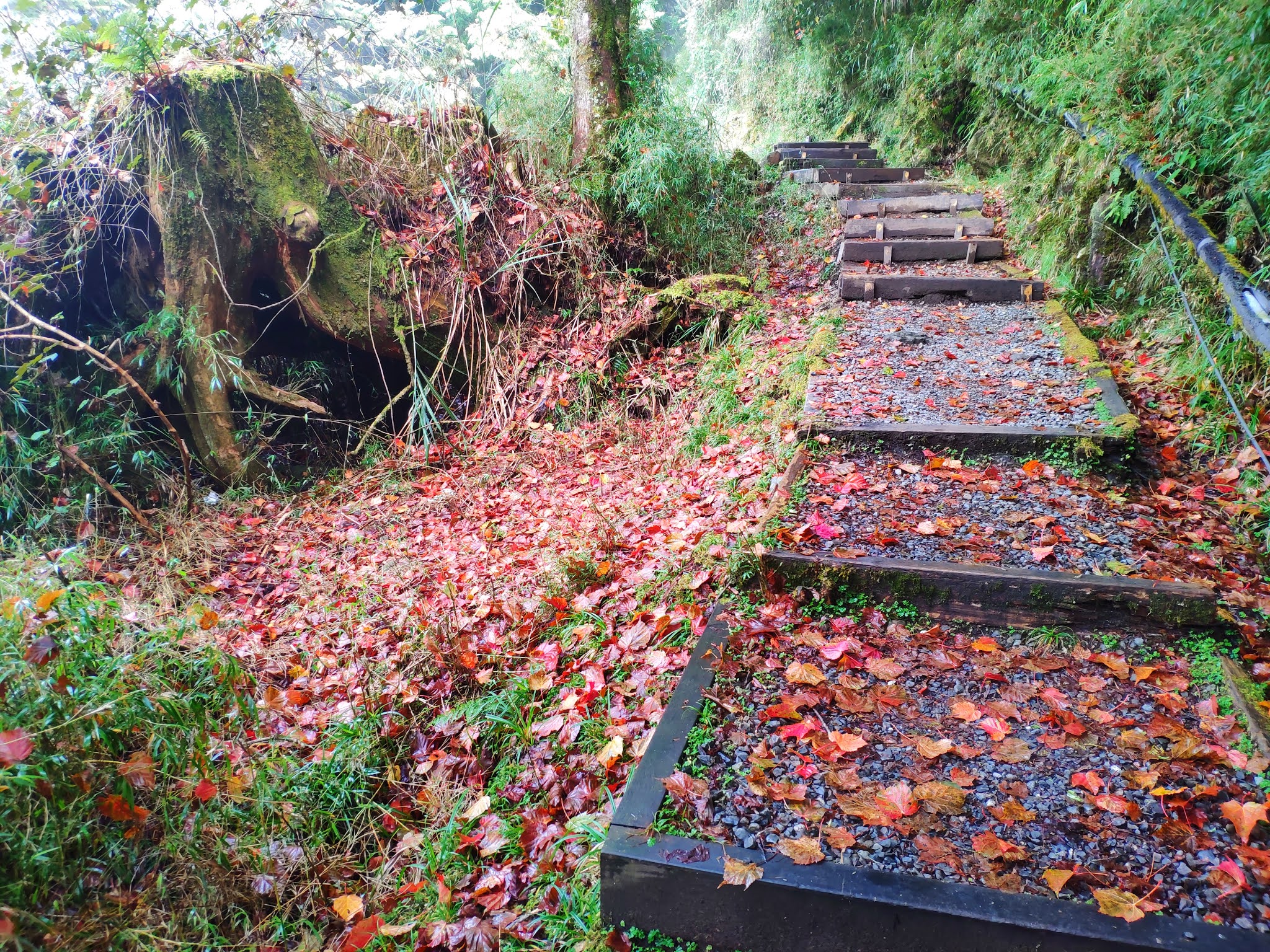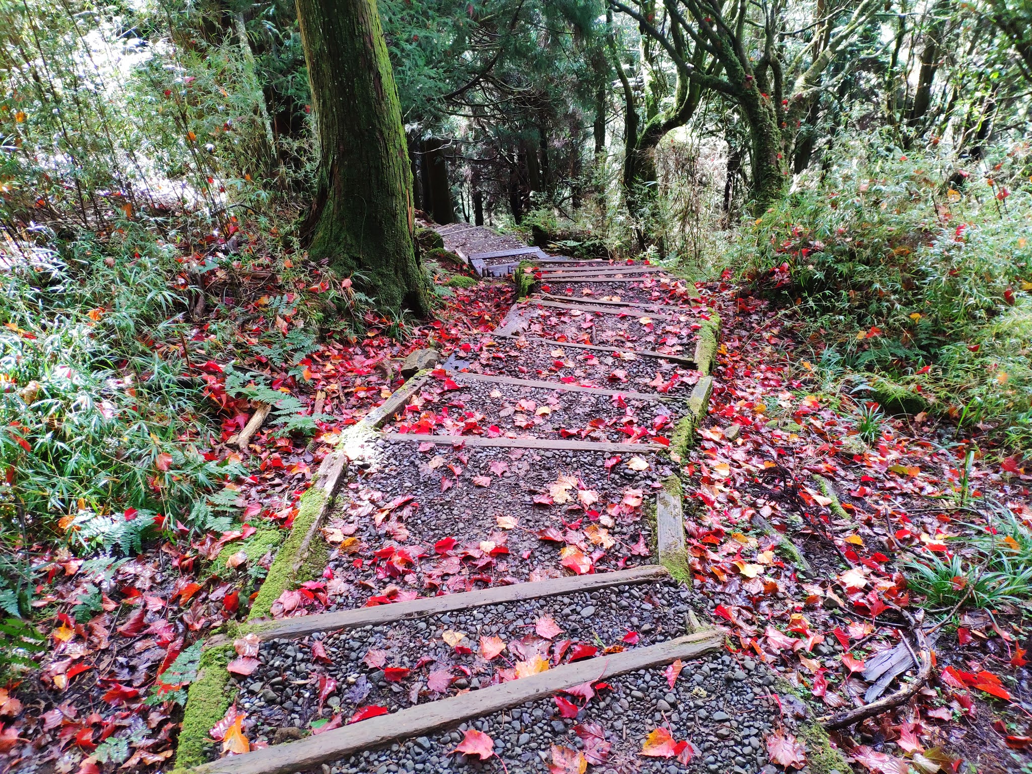 後面1.7公里的路程是一路陡上,階梯眾多,但只需要配合自身體力、調節呼吸,最終便能抵達山頂。沿路的楓葉紅一塊、黃一塊,充滿麥當勞色系的楓葉地毯,值得令人駐足許久,說到這裡肚子好餓。途中會經過二代木紅檜,很適合拍照留念。塔山的山頂無基點,但是天氣放晴時展望良好。