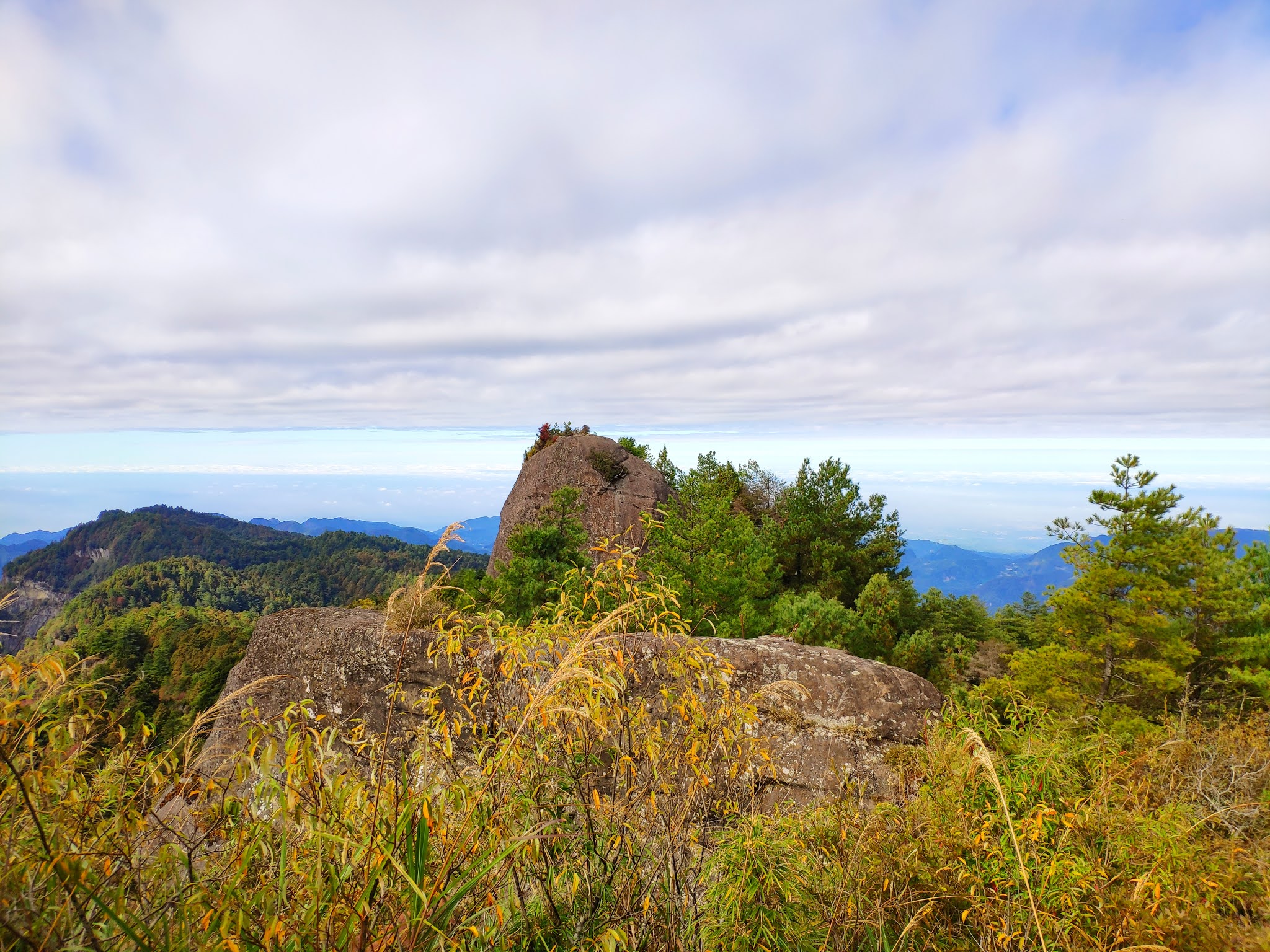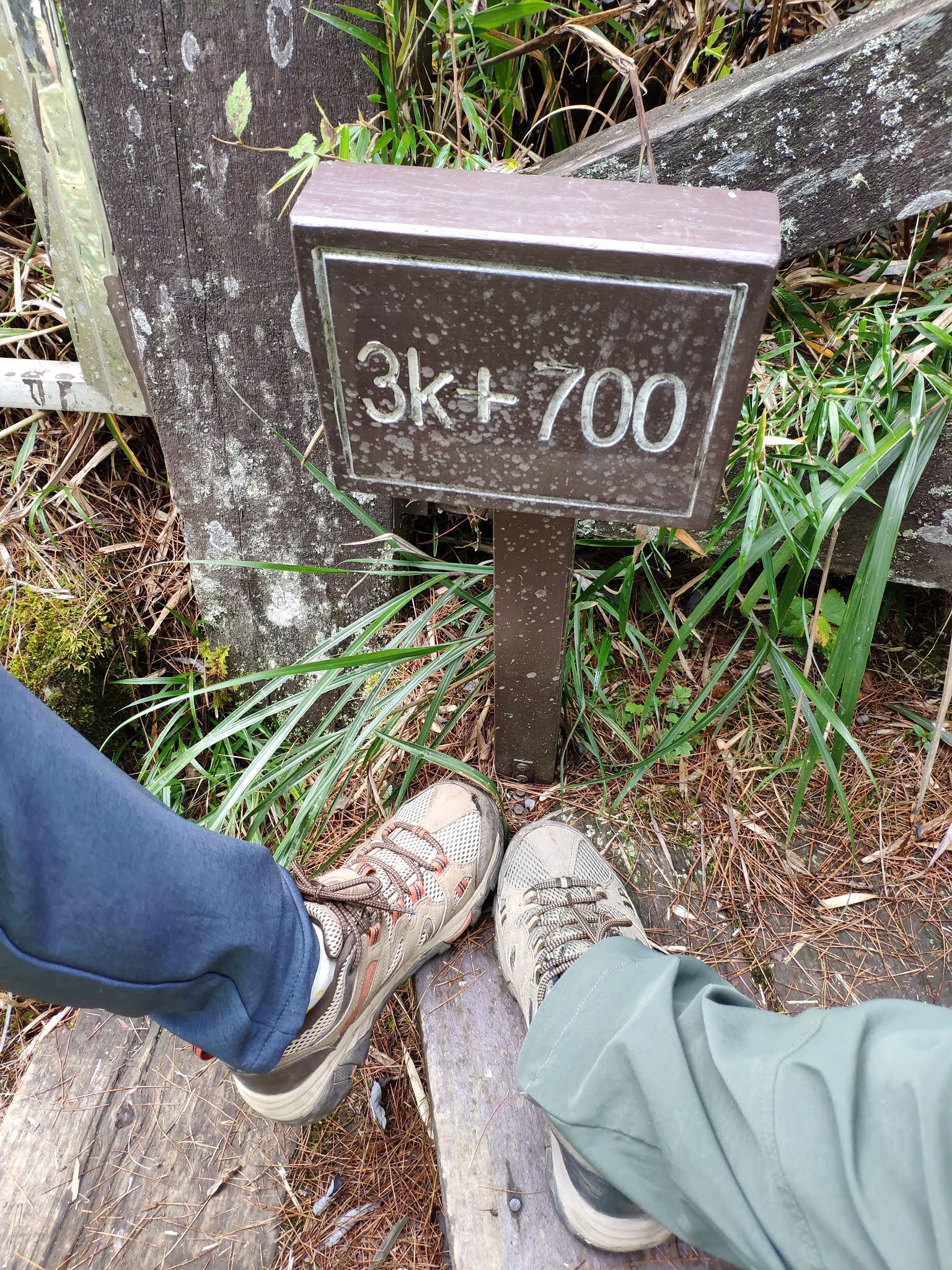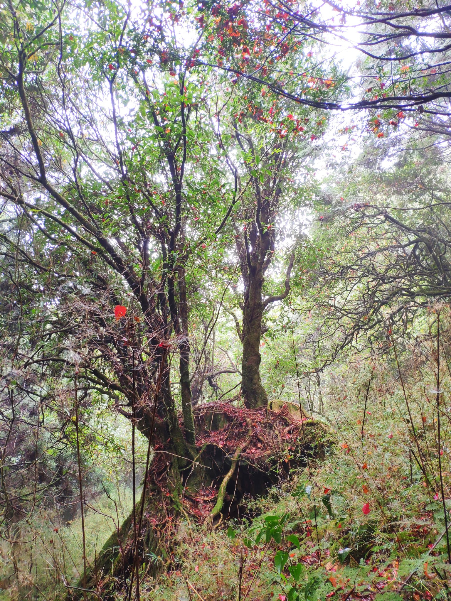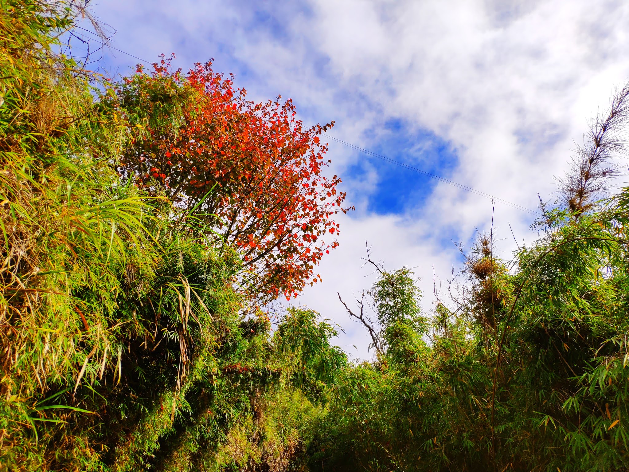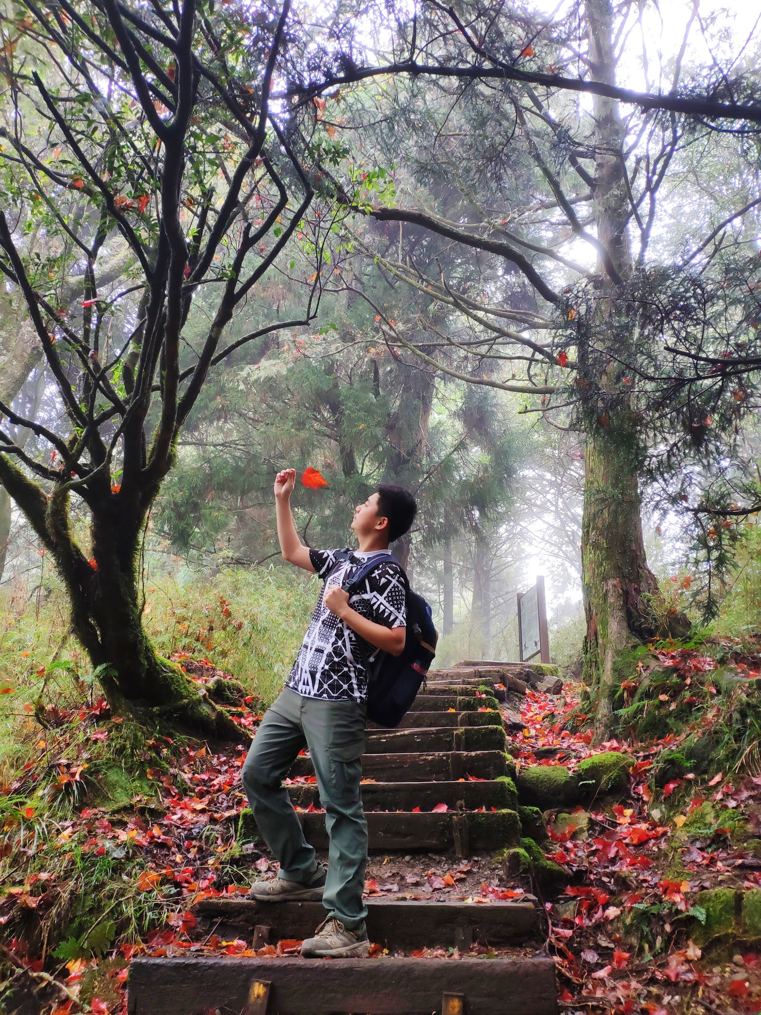後面1.7公里的路程是一路陡上,階梯眾多,但只需要配合自身體力、調節呼吸,最終便能抵達山頂。沿路的楓葉紅一塊、黃一塊,充滿麥當勞色系的楓葉地毯,值得令人駐足許久,說到這裡肚子好餓。途中會經過二代木紅檜,很適合拍照留念。塔山的山頂無基點,但是天氣放晴時展望良好。