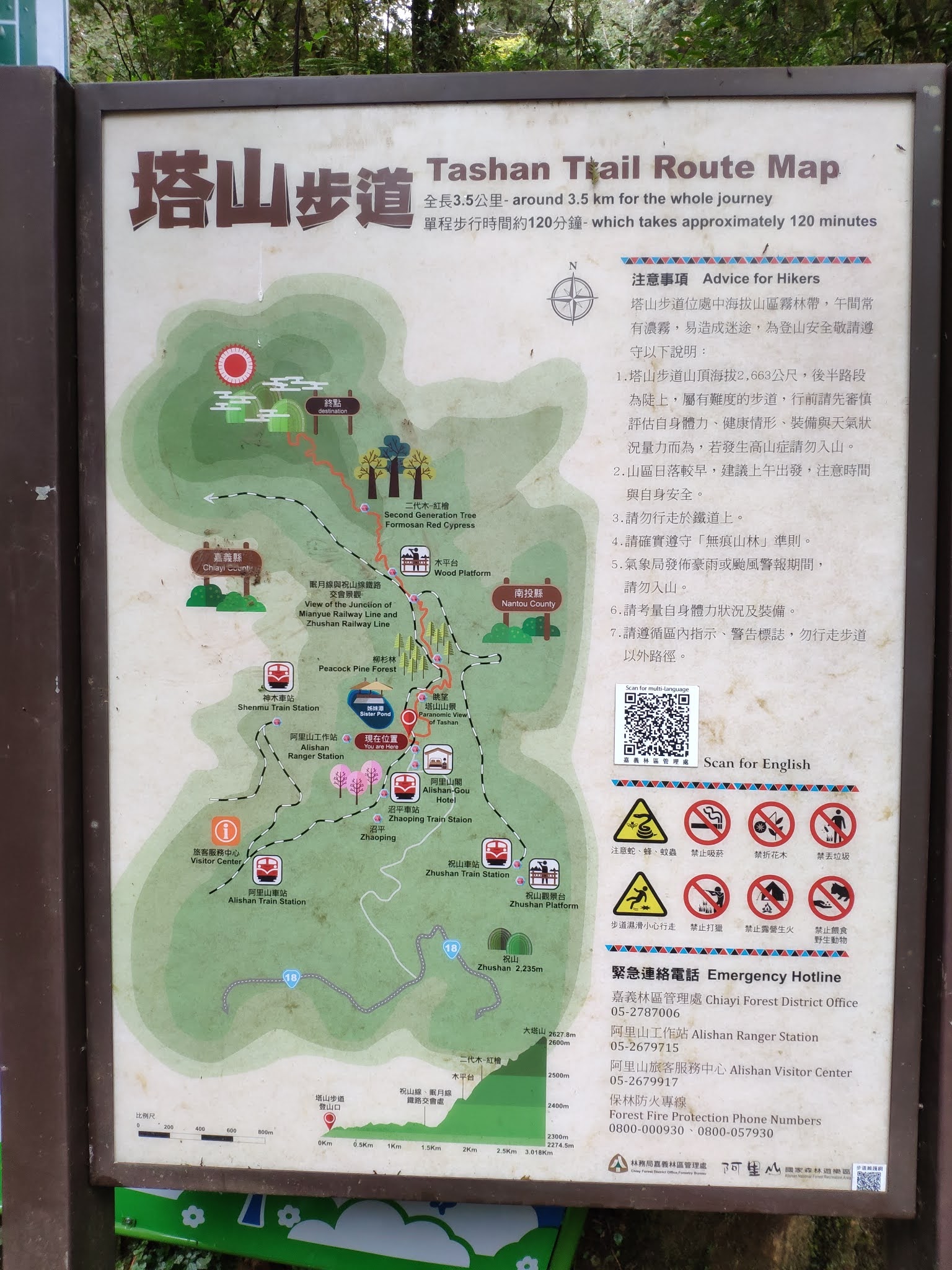 路線:阿里山車站->沼平公園/沼平車站->姊妹潭->木平台->塔山步道->二代木->塔山觀景台